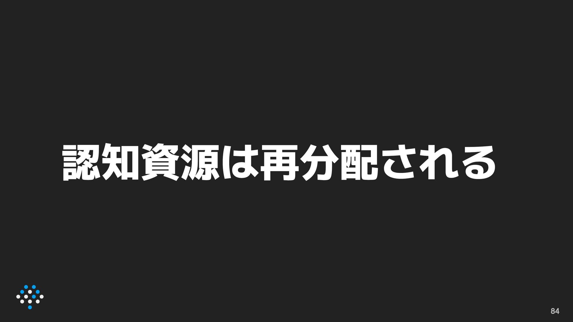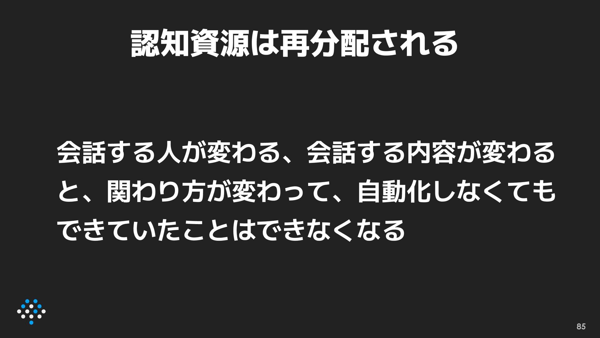 認知資源は再分配される 会話する人が変わる、会話する内容が変わる と、関わり方が変わって、自動化しなくても できていたことはできなくなる 85