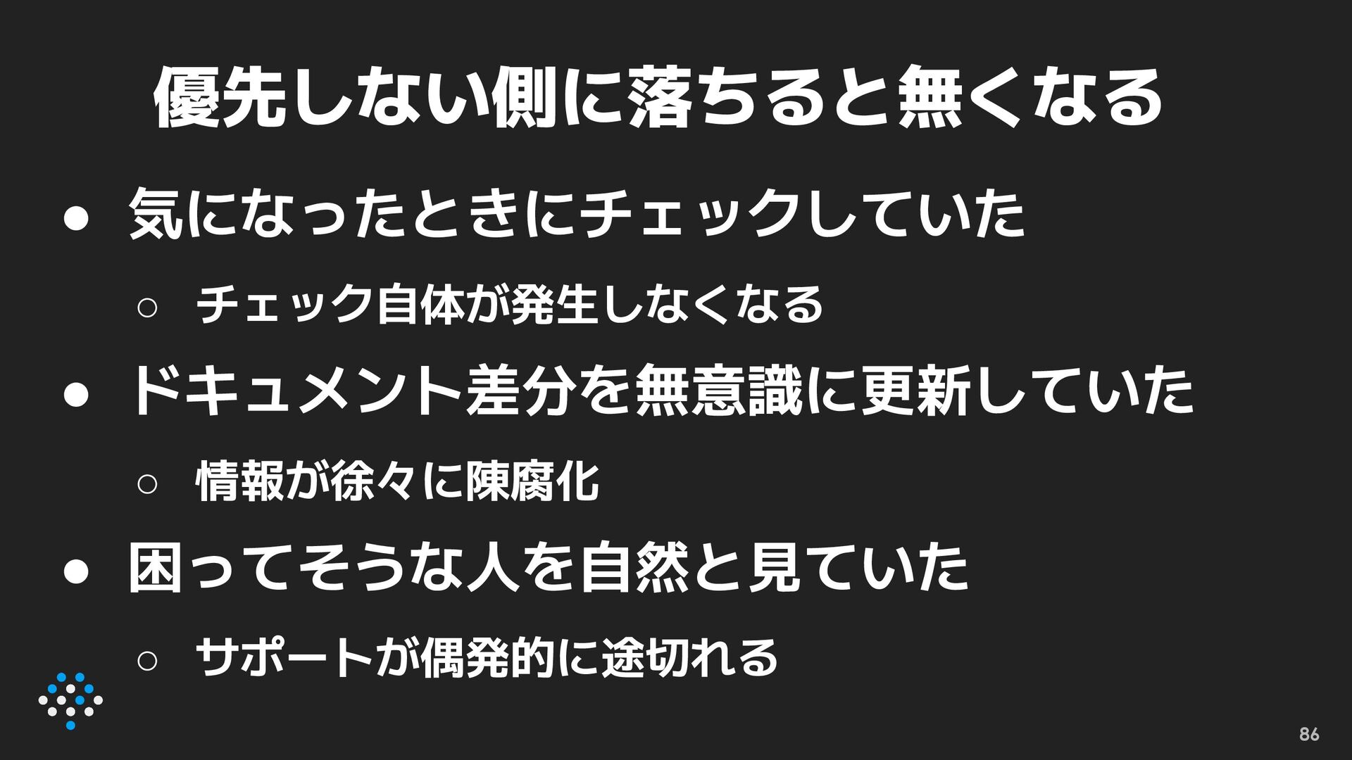 優先しない側に落ちると無くなる • 気になったときにチェックしていた ◦ チェック自体が発生しなくなる • ドキュメント差分を無意識に更新していた ◦ 情報が徐々に陳腐化 •