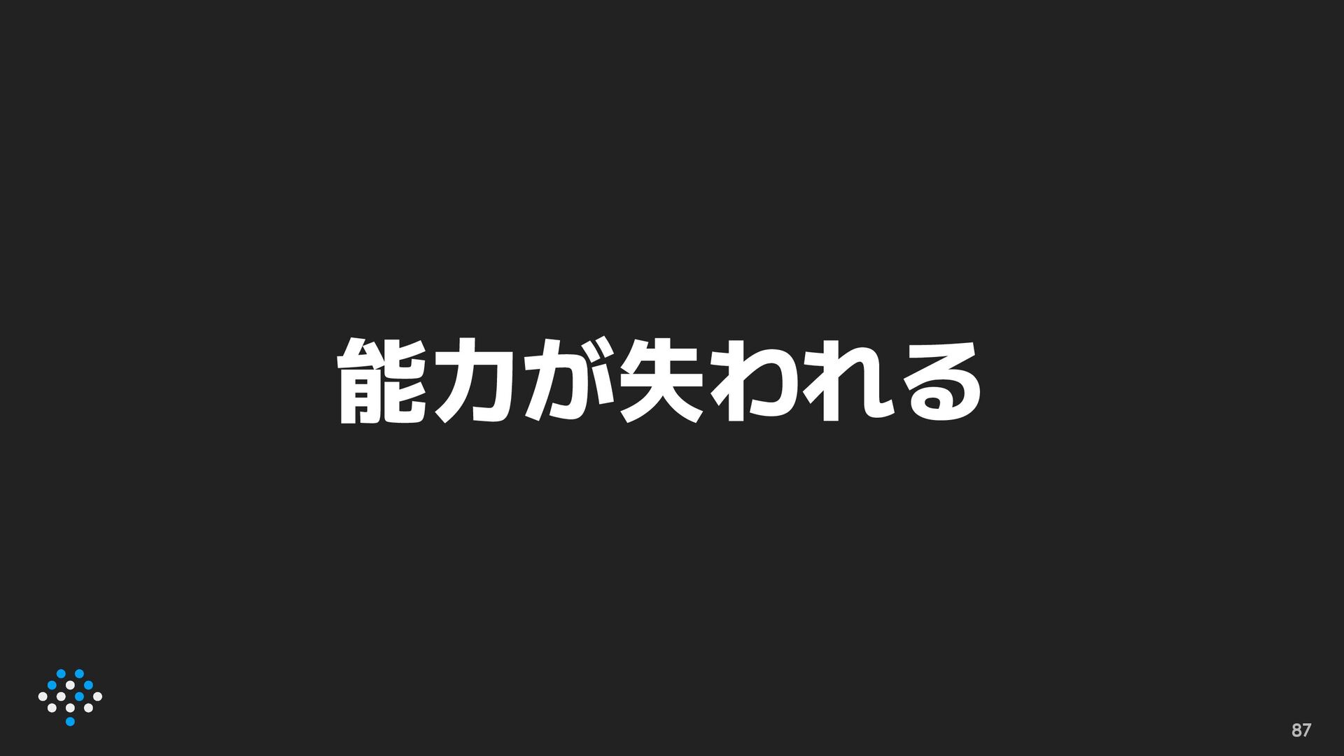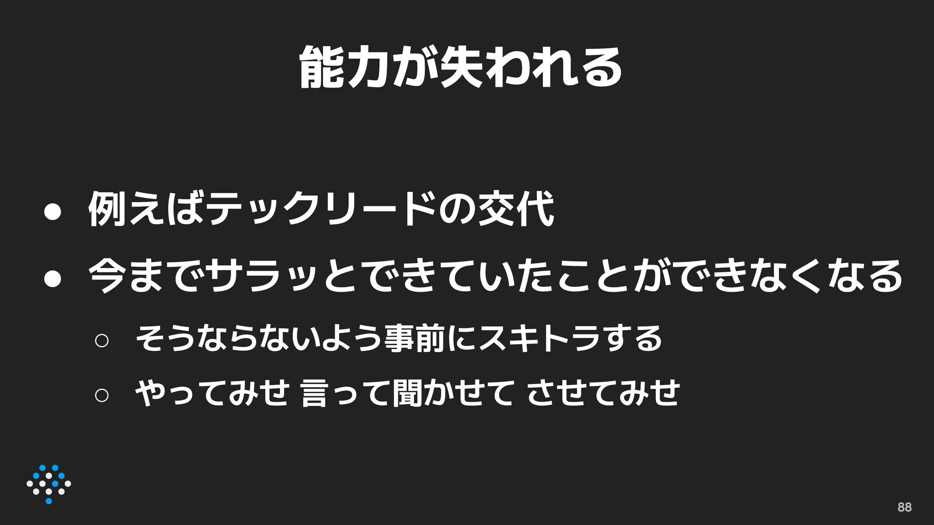能力が失われる • 例えばテックリードの交代 • 今までサラッとできていたことができなくなる ◦ そうならないよう事前にスキトラする ◦ やってみせ 言って聞かせて