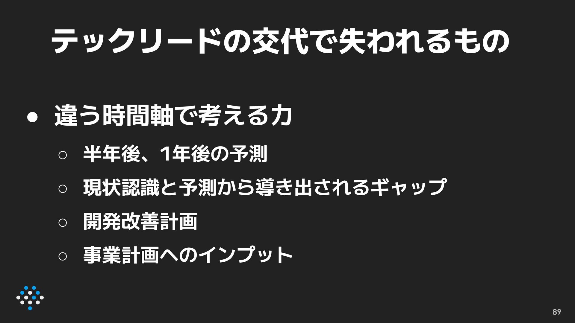 テックリードの交代で失われるもの • 違う時間軸で考える力 ◦ 半年後、1年後の予測 ◦ 現状認識と予測から導き出されるギャップ ◦ 開発改善計画 ◦