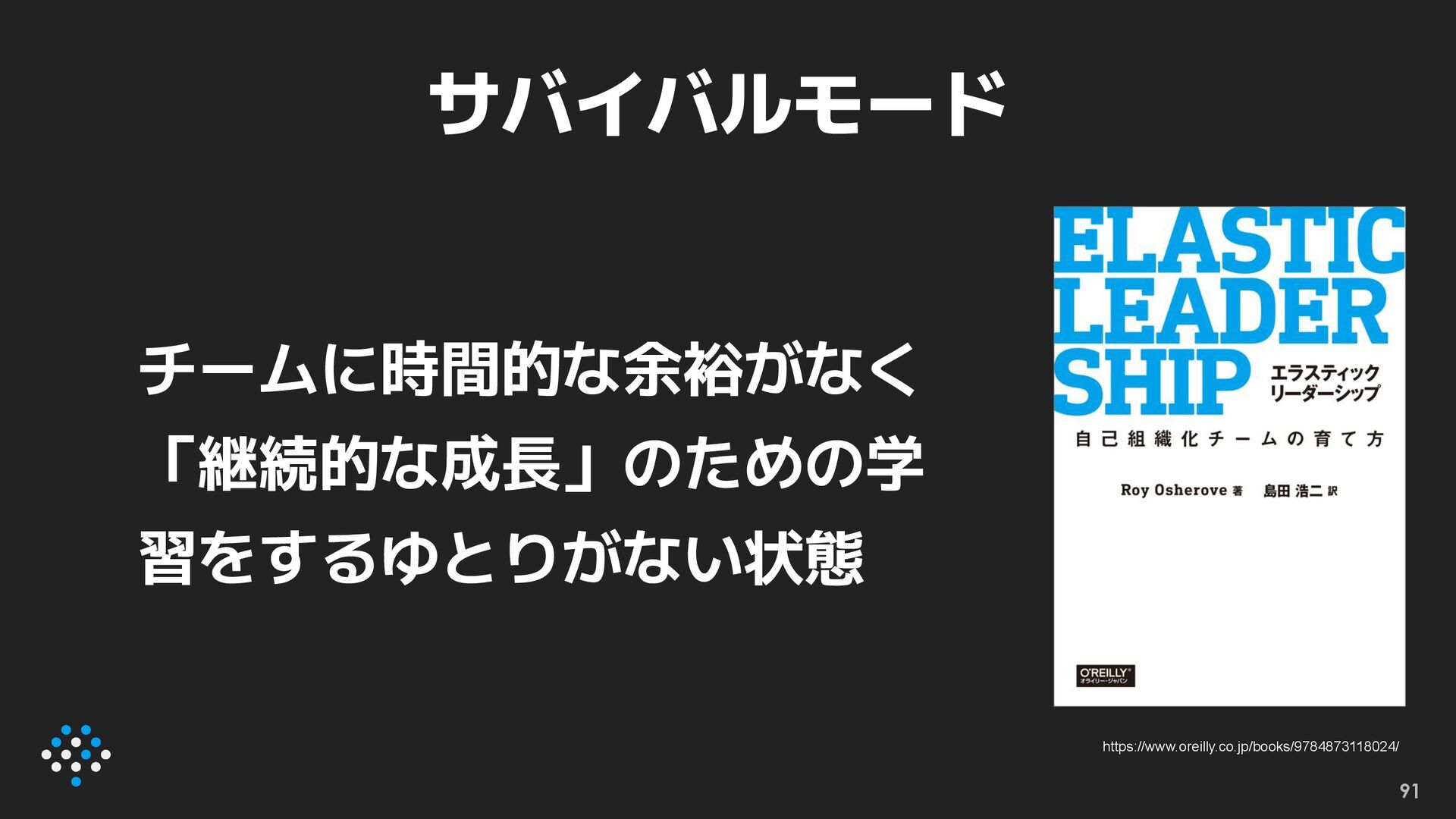 サバイバルモード チームに時間的な余裕がなく 「継続的な成長」のための学 習をするゆとりがない状態 91 https://www.oreilly.co.jp/books/9784873118024/