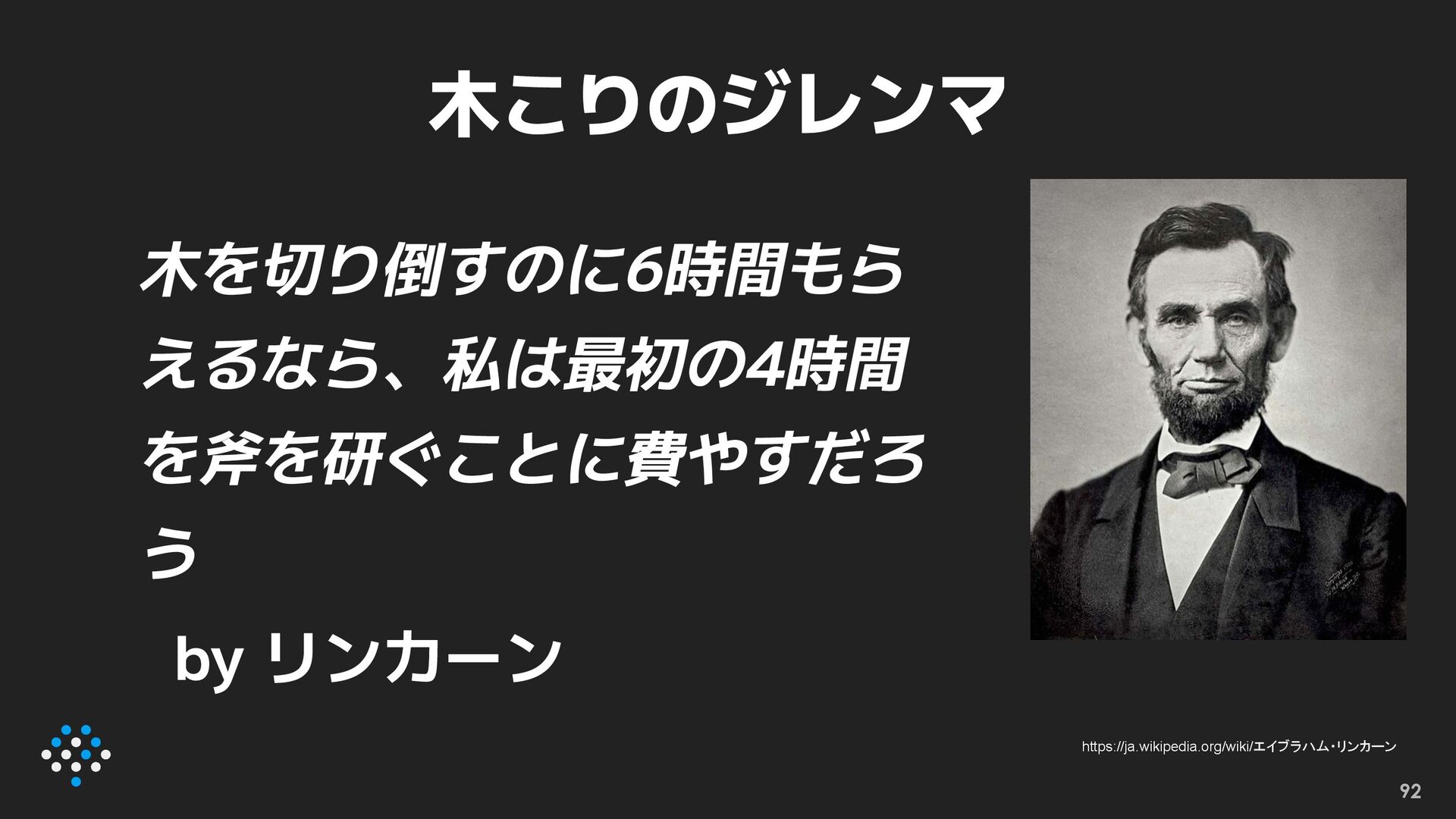 木こりのジレンマ 92 木を切り倒すのに6時間もら えるなら、私は最初の4時間 を斧を研ぐことに費やすだろ う by リンカーン https://ja.wikipedia.org/wiki/エイブラハム・リンカーン
