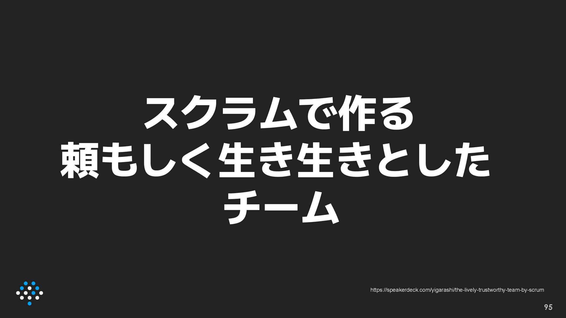 95 スクラムで作る 頼もしく生き生きとした チーム https://speakerdeck.com/yigarashi/the-lively-trustworthy-team-by-scrum
