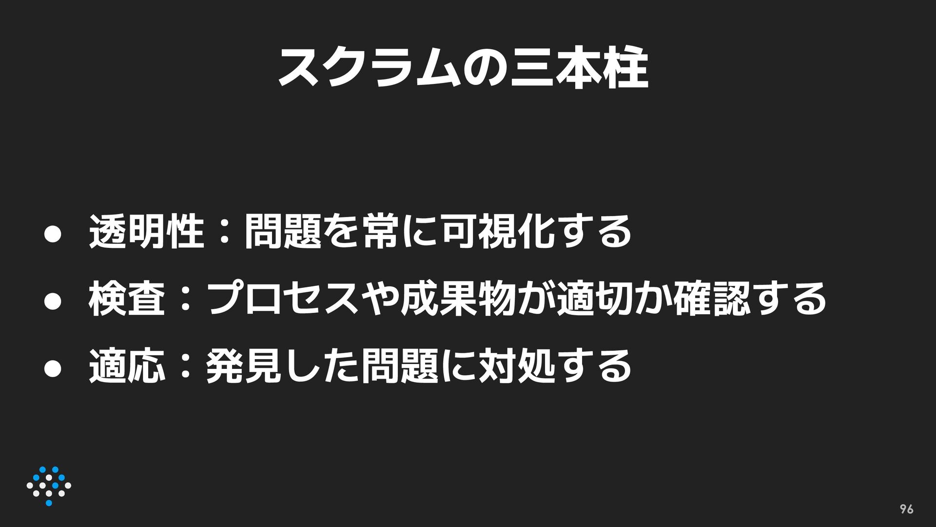 スクラムの三本柱 96 • 透明性:問題を常に可視化する • 検査:プロセスや成果物が適切か確認する • 適応:発見した問題に対処する