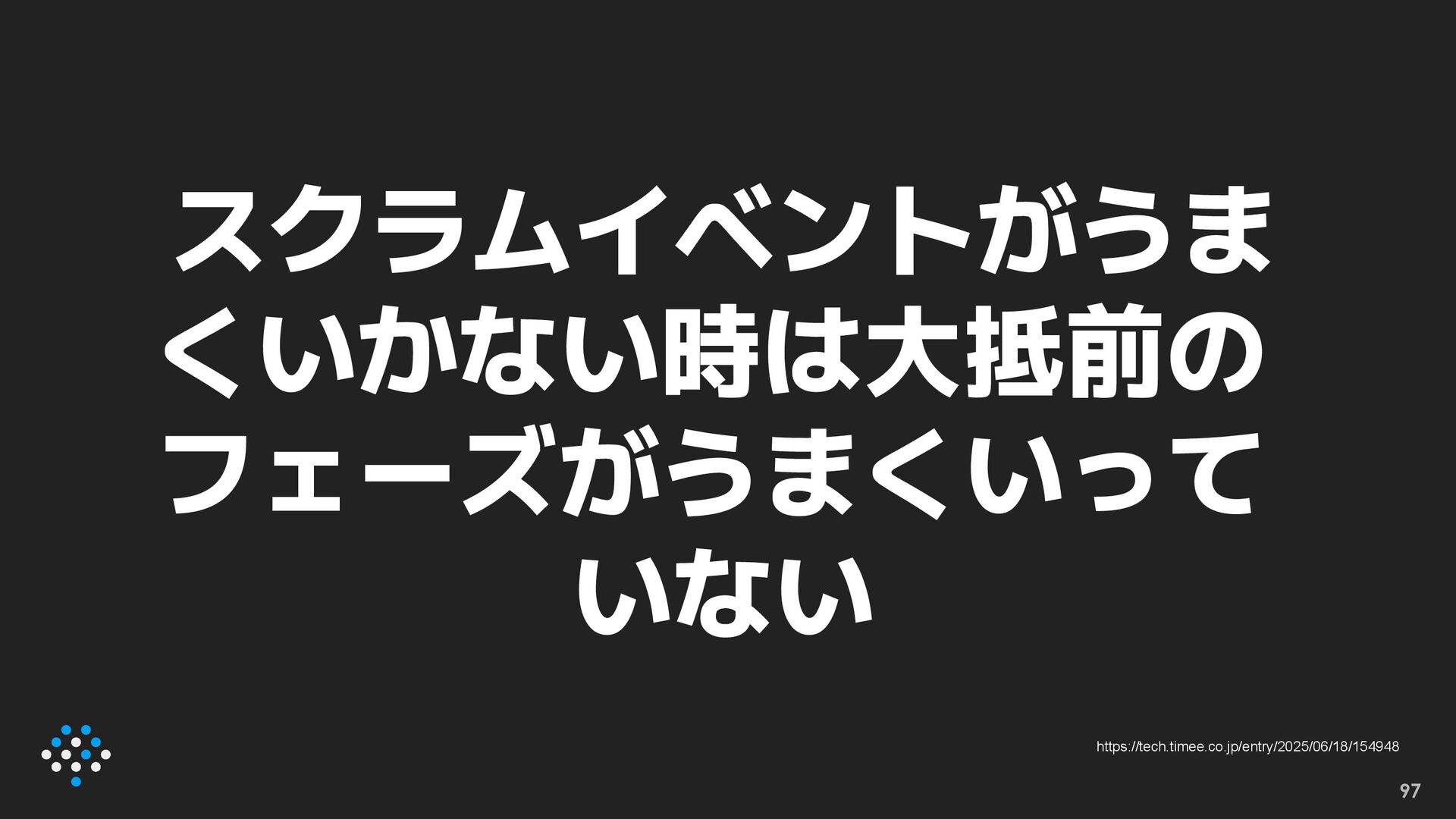 97 スクラムイベントがうま くいかない時は大抵前の フェーズがうまくいって いない https://tech.timee.co.jp/entry/2025/06/18/154948
