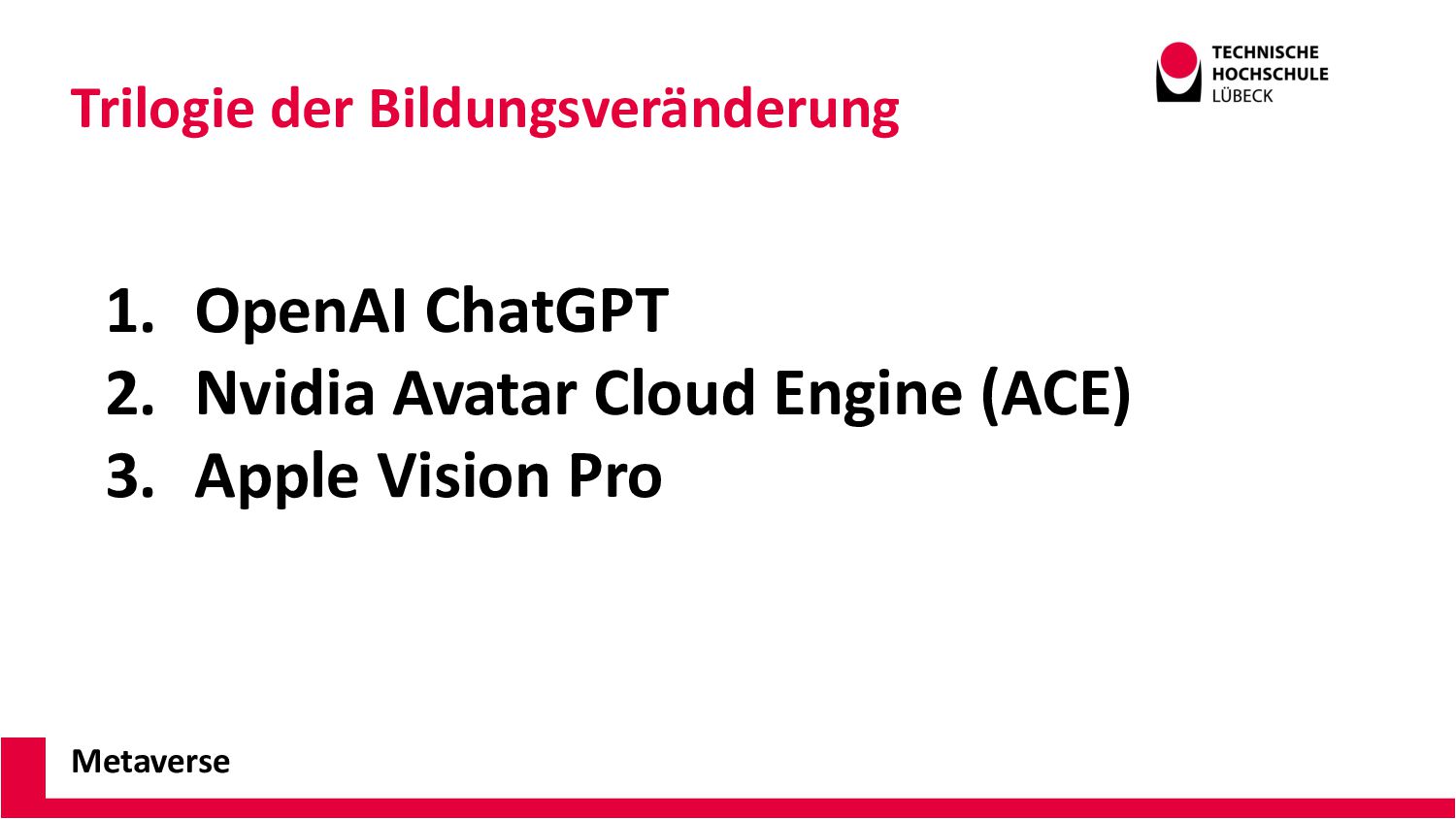 Vortrag bei der Moodlemoot in Zürich 2023 über KI, Metaverse, Avatare bzw. ChatGPT, Vision Pro und Avatar Cloud Engine. Ersetzen diese Systeme bald den Lehrer bzw. den Lernort? Wie ändert KI unsere Bildung und wollen wir das überhaupt?