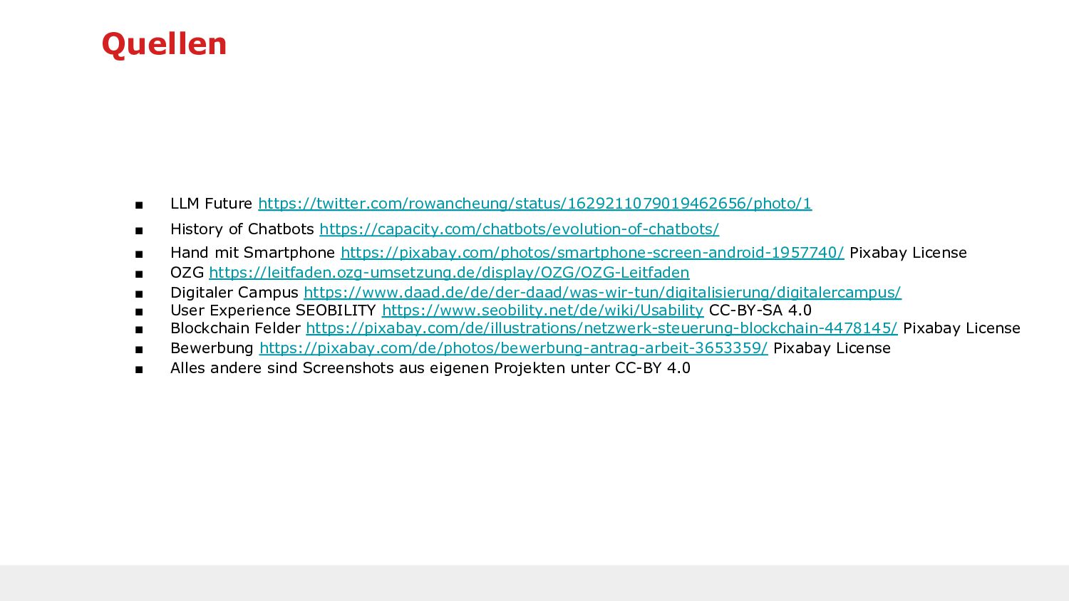 ▪ Hand mit Smartphone https://pixabay.com/photos/smartphone-screen-android-1957740/ Pixabay License ▪ OZG https://leitfaden.ozg-umsetzung.de/display/OZG/OZG-Leitfaden ▪ Digitaler Campus https://www.daad.de/de/der-daad/was-wir-tun/digitalisierung/digitalercampus/ ▪ User Experience SEOBILITY https://www.seobility.net/de/wiki/Usability CC-BY-SA 4.0 ▪ Blockchain Felder https://pixabay.com/de/illustrations/netzwerk-steuerung-blockchain-4478145/ Pixabay License ▪ Bewerbung https://pixabay.com/de/photos/bewerbung-antrag-arbeit-3653359/ Pixabay License ▪ Alles andere sind Screenshots aus eigenen Projekten unter CC-BY 4.0