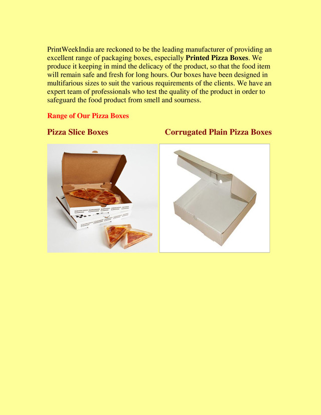 Best quality printed pizza boxes are available at Printweekindia.com. Any food restaurant can acquire the best pizza slice boxes, corrugated plain pizza boxes, corrugated printed pizza boxes from us.