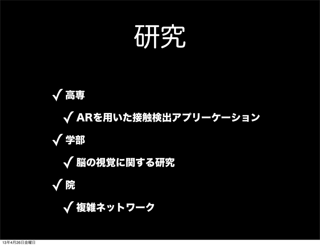 ݚڀ ✓ߴઐ ✓"3Λ༻͍ͨ৮ݕग़ΞϓϦʔέʔγϣϯ ✓ֶ෦ ✓ͷࢹ֮ʹؔ͢Δݚڀ ✓Ӄ ✓ෳࡶωοτϫʔΫ 134݄26༵ۚ