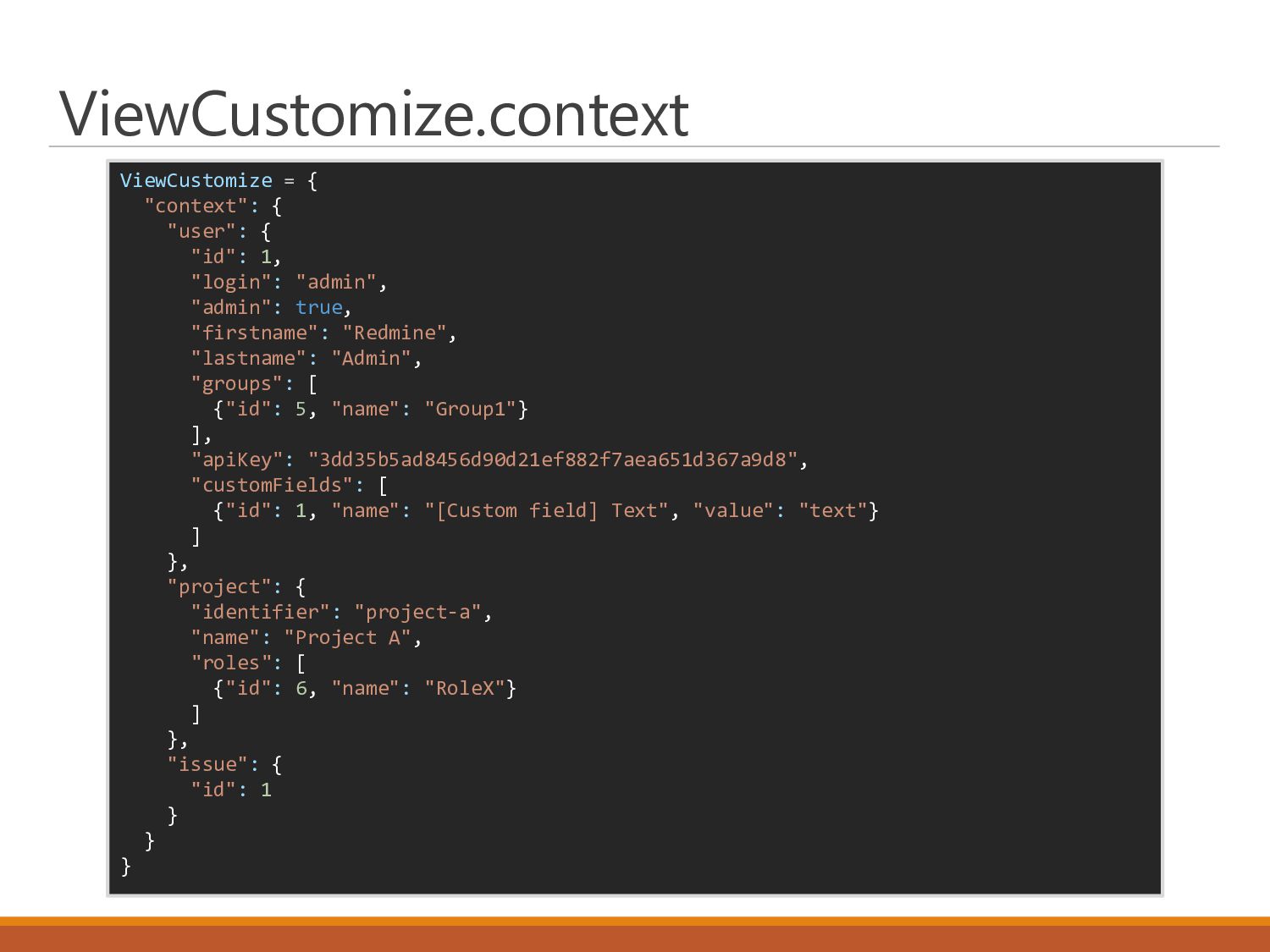"admin", "admin": true, "firstname": "Redmine", "lastname": "Admin", "groups": [ {"id": 5, "name": "Group1"} ], "apiKey": "3dd35b5ad8456d90d21ef882f7aea651d367a9d8", "customFields": [ {"id": 1, "name": "[Custom field] Text", "value": "text"} ] }, "project": { "identifier": "project-a", "name": "Project A", "roles": [ {"id": 6, "name": "RoleX"} ] }, "issue": { "id": 1 } } } ViewCustomize.context