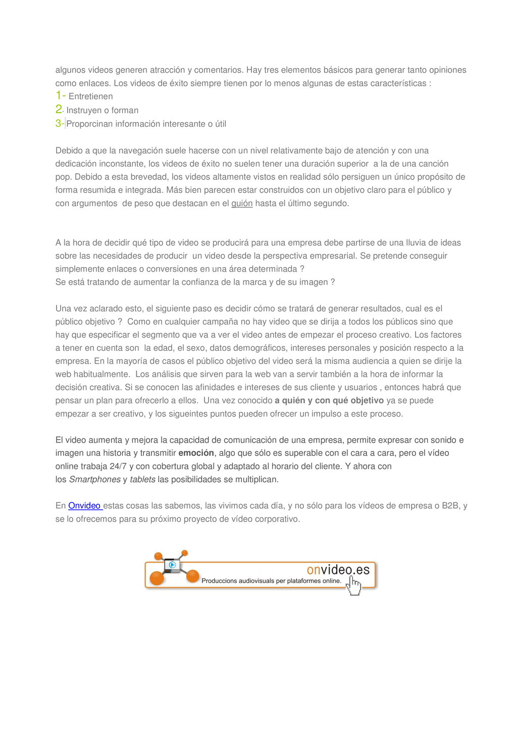 para generar tanto opiniones como enlaces. Los videos de éxito siempre tienen por lo menos algunas de estas características : 1- Entretienen 2- Instruyen o forman 3- Proporcinan información interesante o útil Debido a que la navegación suele hacerse con un nivel relativamente bajo de atención y con una dedicación inconstante, los videos de éxito no suelen tener una duración superior a la de una canción pop. Debido a esta brevedad, los videos altamente vistos en realidad sólo persiguen un único propósito de forma resumida e integrada. Más bien parecen estar construidos con un objetivo claro para el público y con argumentos de peso que destacan en el guión hasta el último segundo. A la hora de decidir qué tipo de video se producirá para una empresa debe partirse de una lluvia de ideas sobre las necesidades de producir un video desde la perspectiva empresarial. Se pretende conseguir simplemente enlaces o conversiones en una área determinada ? Se está tratando de aumentar la confianza de la marca y de su imagen ? Una vez aclarado esto, el siguiente paso es decidir cómo se tratará de generar resultados, cual es el público objetivo ? Como en cualquier campaña no hay video que se dirija a todos los públicos sino que hay que especificar el segmento que va a ver el video antes de empezar el proceso creativo. Los factores a tener en cuenta son la edad, el sexo, datos demográficos, intereses personales y posición respecto a la empresa. En la mayoría de casos el público objetivo del video será la misma audiencia a quien se dirije la web habitualmente. Los análisis que sirven para la web van a servir también a la hora de informar la decisión creativa. Si se conocen las afinidades e intereses de sus cliente y usuarios , entonces habrá que pensar un plan para ofrecerlo a ellos. Una vez conocido a quién y con qué objetivo ya se puede empezar a ser creativo, y los sigueintes puntos pueden ofrecer un impulso a este proceso. El video aumenta y mejora la capacidad de comunicación de una empresa, permite expresar con sonido e imagen una historia y transmitir emoción, algo que sólo es superable con el cara a cara, pero el vídeo online trabaja 24/7 y con cobertura global y adaptado al horario del cliente. Y ahora con los Smartphones y tablets las posibilidades se multiplican. En Onvideo estas cosas las sabemos, las vivimos cada día, y no sólo para los vídeos de empresa o B2B, y se lo ofrecemos para su próximo proyecto de vídeo corporativo.