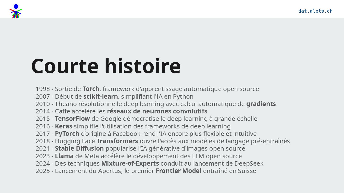 automatique open source 2007 - Début de scikit-learn, simplifiant l'IA en Python 2010 - Theano révolutionne le deep learning avec calcul automatique de gradients 2014 - Caffe accélère les réseaux de neurones convolutifs 2015 - TensorFlow de Google démocratise le deep learning à grande échelle 2016 - Keras simplifie l'utilisation des frameworks de deep learning 2017 - PyTorch d’origine à Facebook rend l'IA encore plus flexible et intuitive 2018 - Hugging Face Transformers ouvre l'accès aux modèles de langage pré-entraînés 2021 - Stable Diffusion popularise l'IA générative d'images open source 2023 - Llama de Meta accélère le développement des LLM open source 2024 - Des techniques Mixture-of-Experts conduit au lancement de DeepSeek 2025 - Lancement du Apertus, le premier Frontier Model entraîné en Suisse