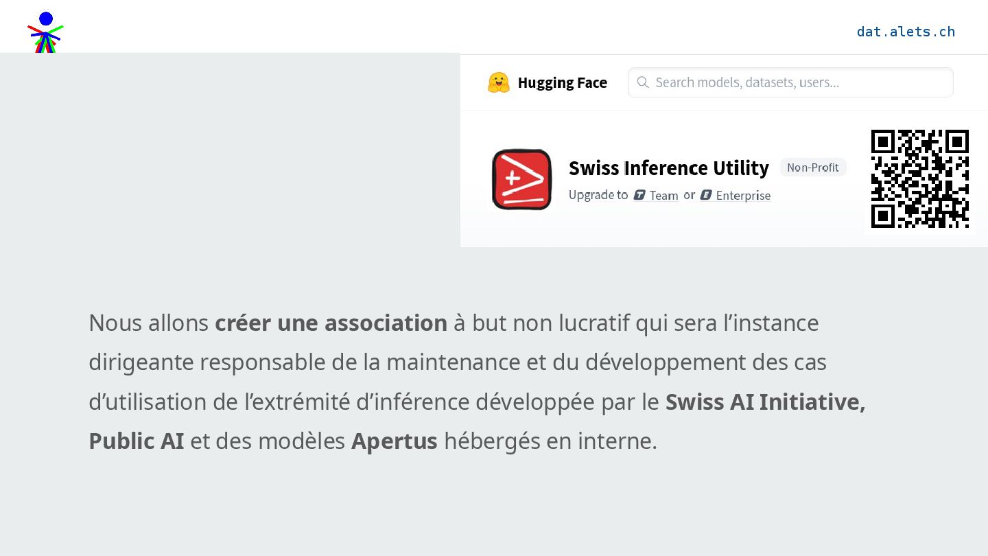 qui sera l’instance dirigeante responsable de la maintenance et du développement des cas d’utilisation de l’extrémité d’inférence développée par le Swiss AI Initiative, Public AI et des modèles Apertus hébergés en interne.