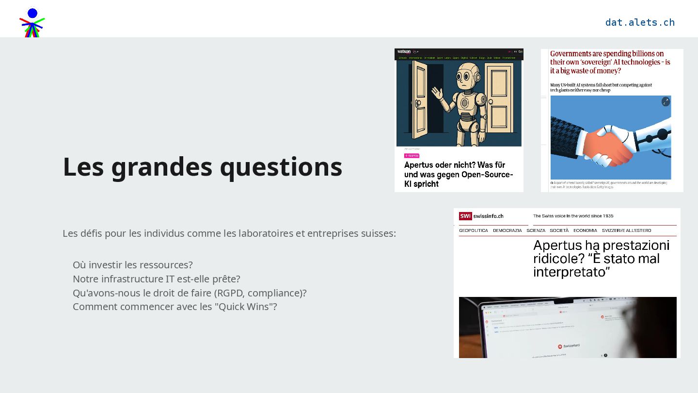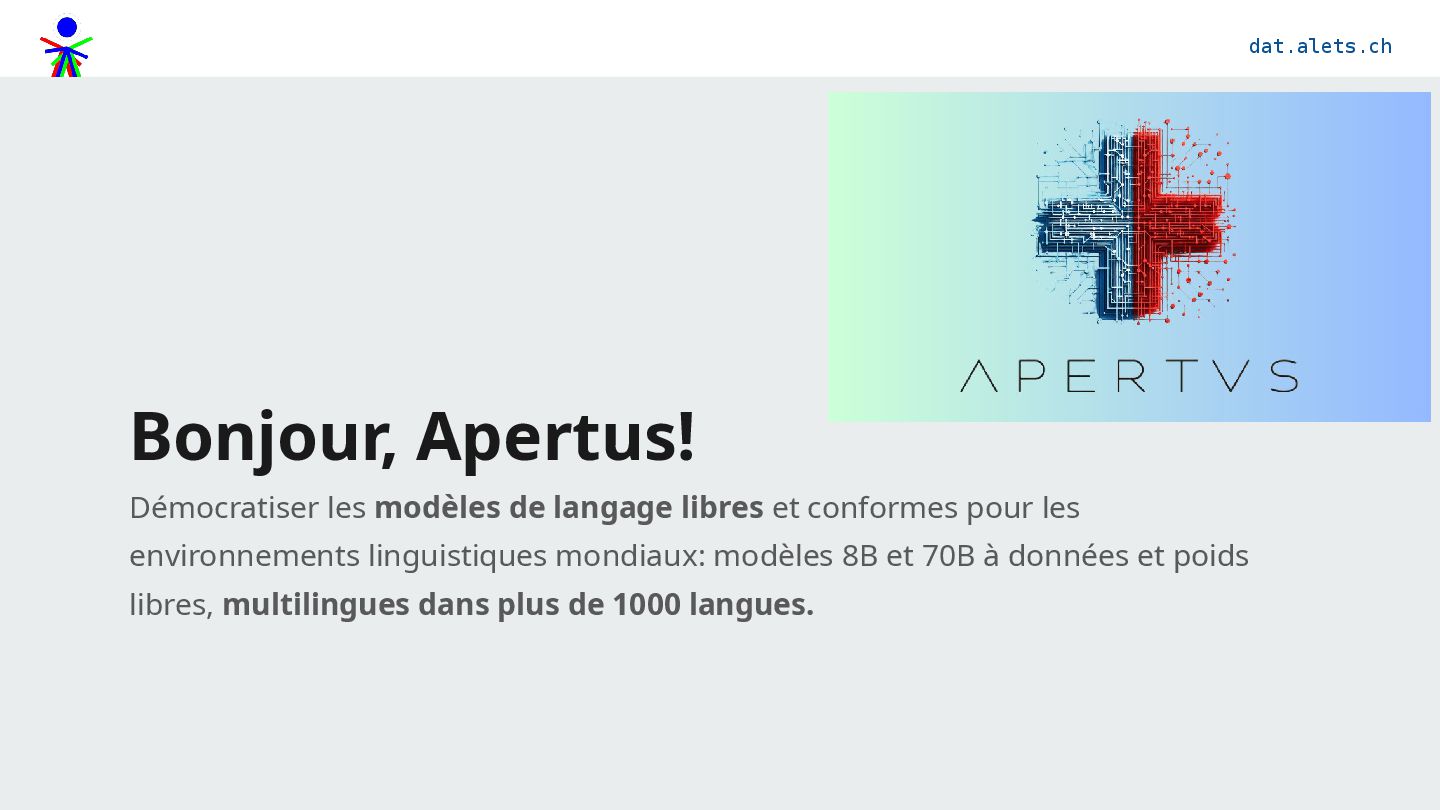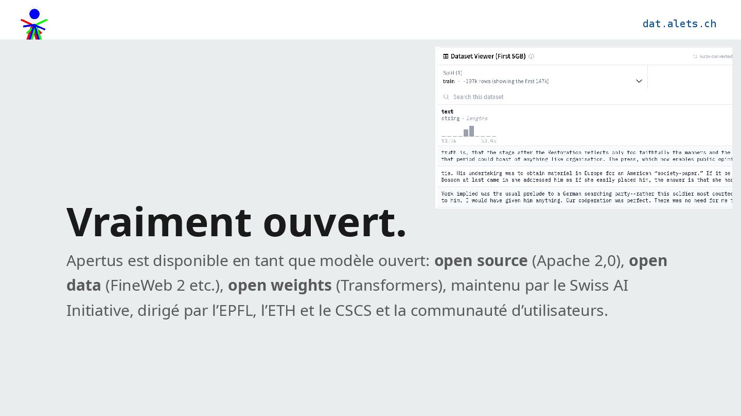 ouvert: open source (Apache 2,0), open data (FineWeb 2 etc.), open weights (Transformers), maintenu par le Swiss AI Initiative, dirigé par l’EPFL, l’ETH et le CSCS et la communauté d’utilisateurs.