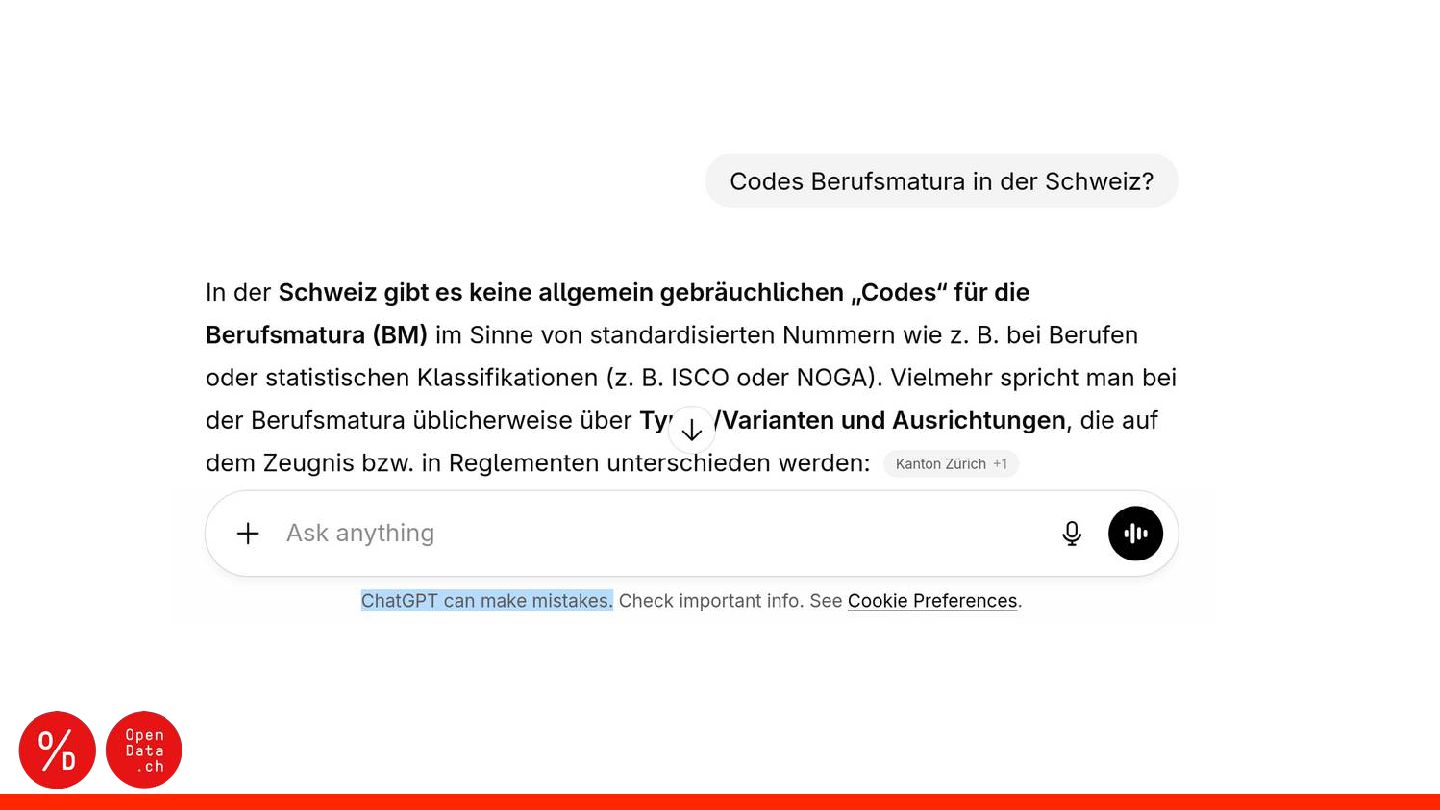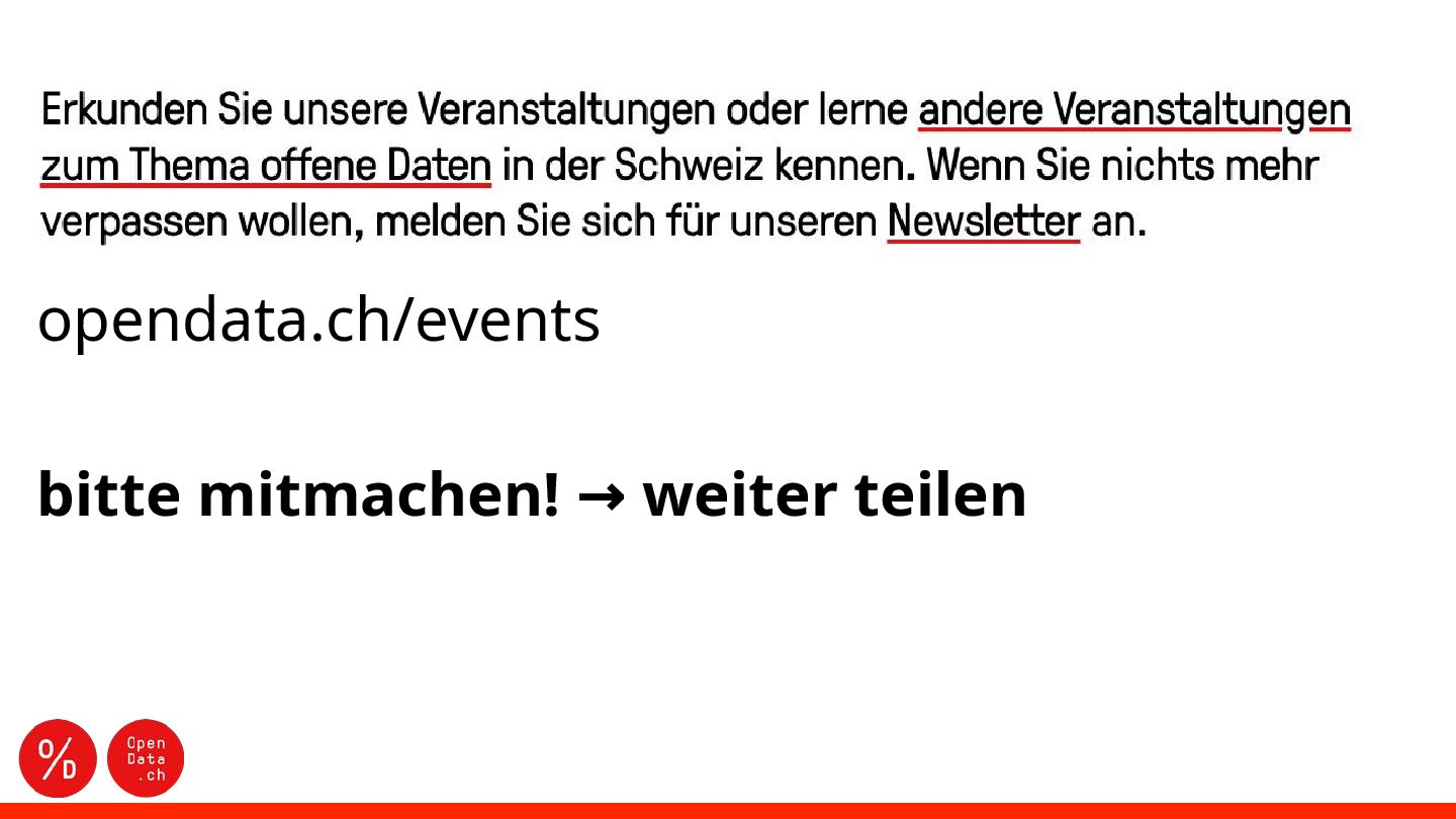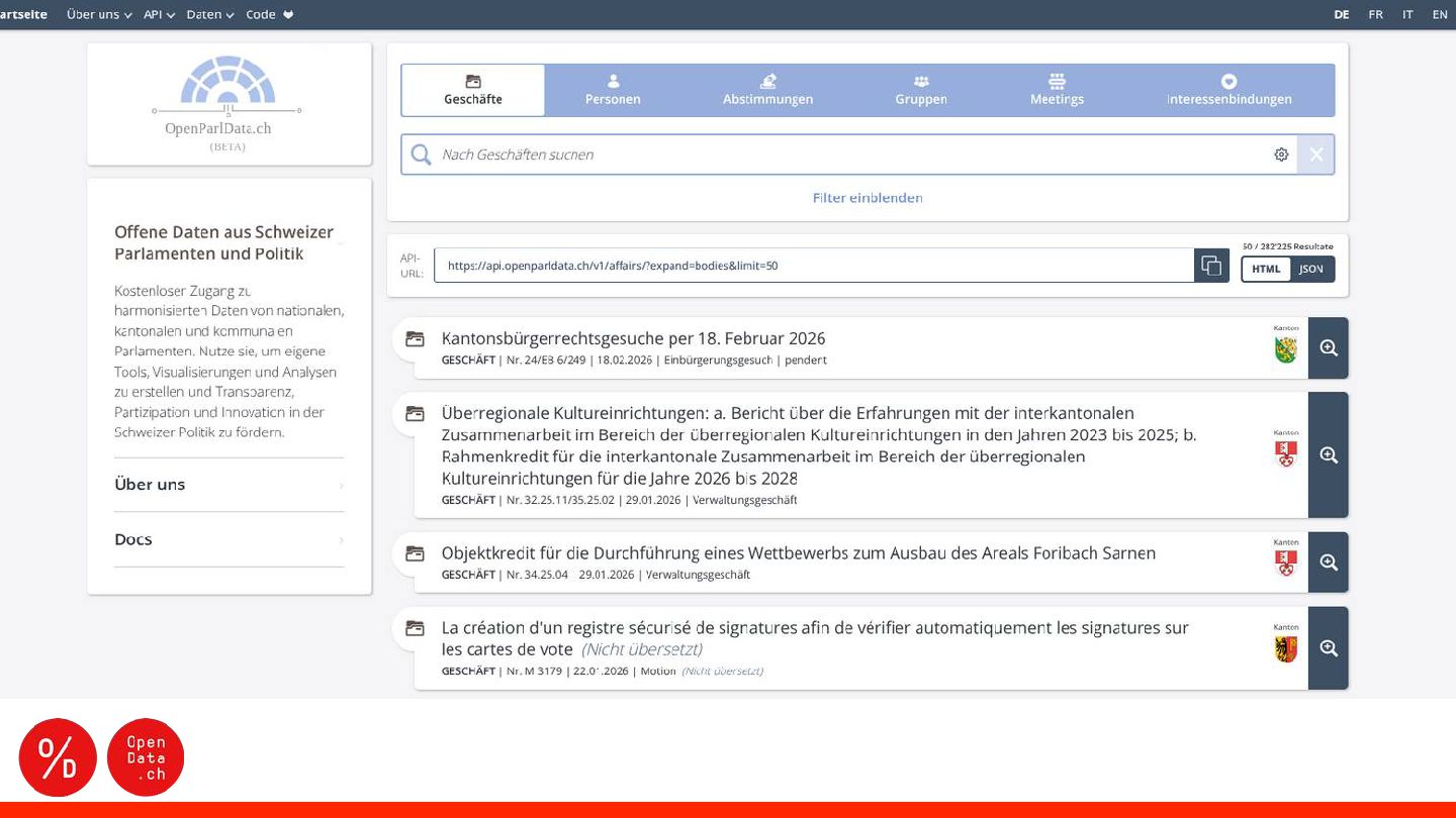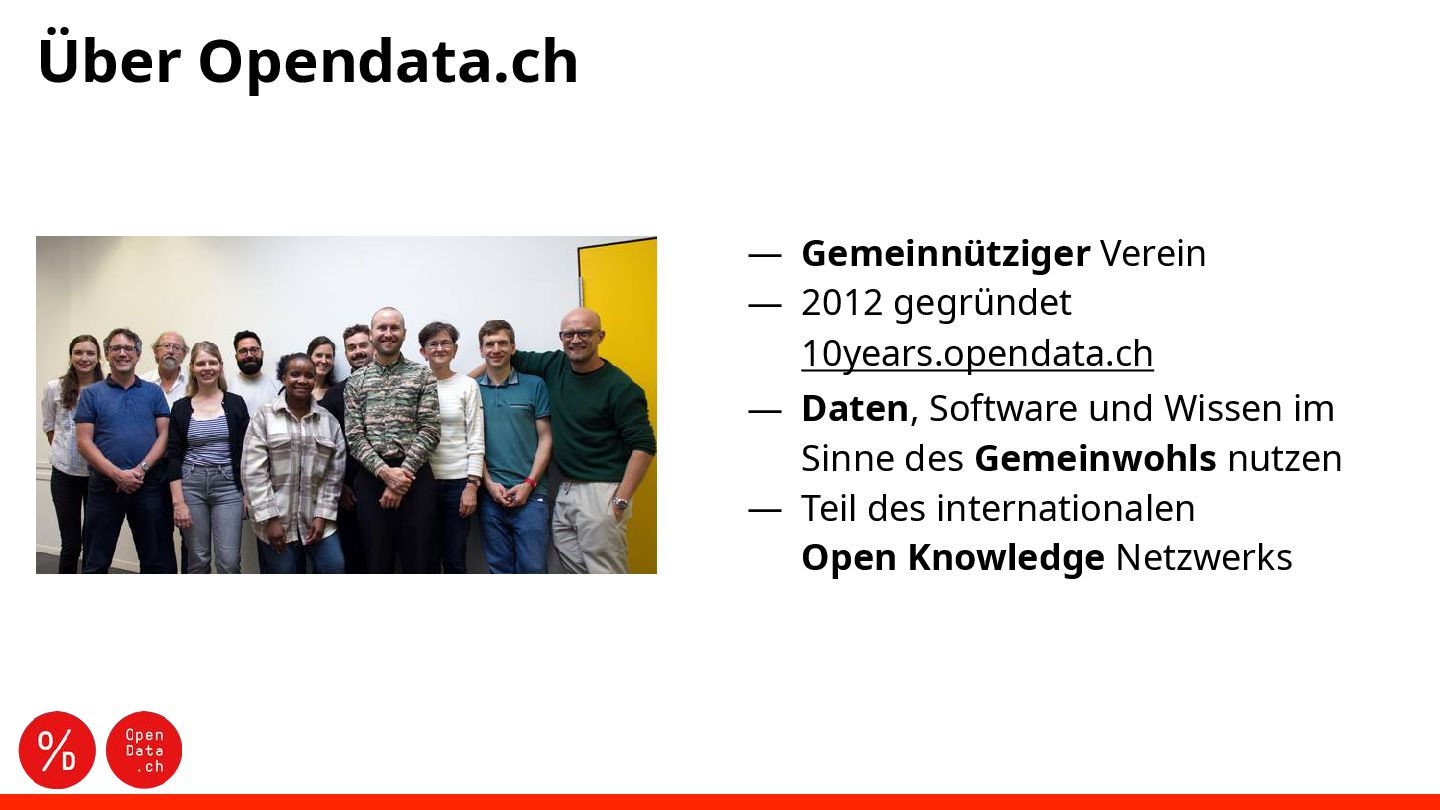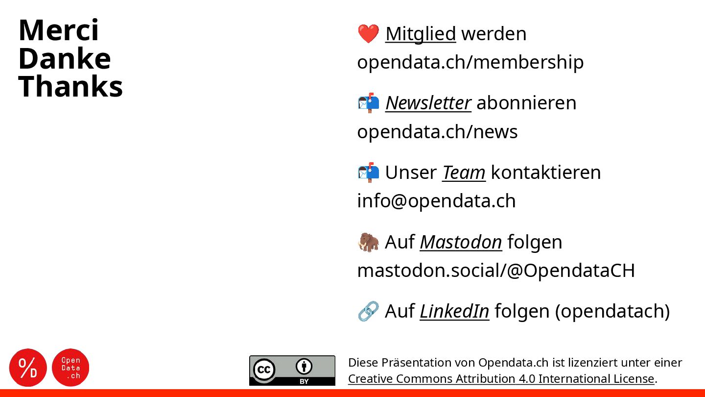 opendata.ch/news Unser 📬 Team kontaktieren [email protected] Auf 🦣 Mastodon folgen mastodon.social/@OpendataCH Auf 🔗 LinkedIn folgen (opendatach) Diese Präsentation von Opendata.ch ist lizenziert unter einer Creative Commons Attribution 4.0 International License.