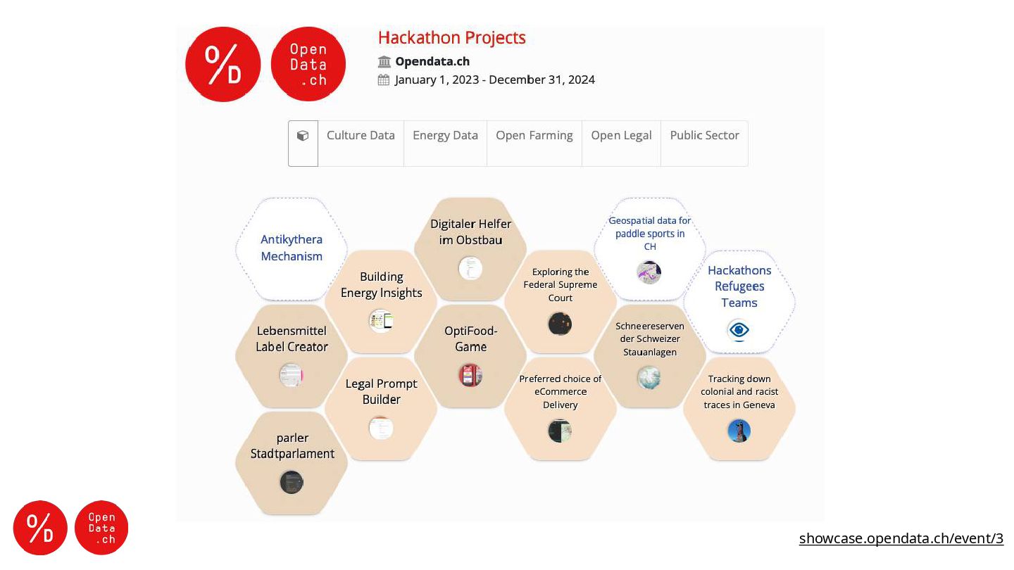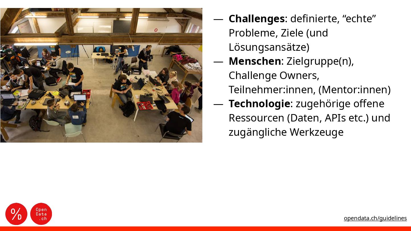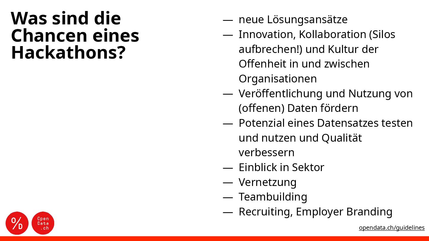 der Offenheit in und zwischen Organisationen ― Veröffentlichung und Nutzung von (offenen) Daten fördern ― Potenzial eines Datensatzes testen und nutzen und Qualität verbessern ― Einblick in Sektor ― Vernetzung ― Teambuilding ― Recruiting, Employer Branding Was sind die Chancen eines Hackathons? opendata.ch/guidelines