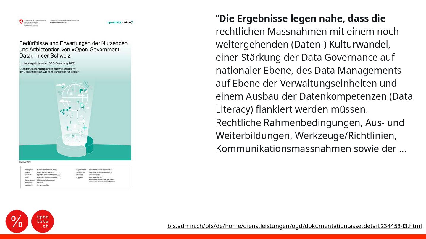 noch weitergehenden (Daten-) Kulturwandel, einer Stärkung der Data Governance auf nationaler Ebene, des Data Managements auf Ebene der Verwaltungseinheiten und einem Ausbau der Datenkompetenzen (Data Literacy) flankiert werden müssen. Rechtliche Rahmenbedingungen, Aus- und Weiterbildungen, Werkzeuge/Richtlinien, Kommunikationsmassnahmen sowie der ... bfs.admin.ch/bfs/de/home/dienstleistungen/ogd/dokumentation.assetdetail.23445843.html