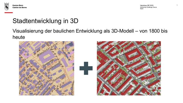 (Zeitstände: vor 1800 | 1800 – 1850 | 1851 – 1900 | 1901 – 1925 | 1926 – 1941 | 1942 – 1962 | 1963 – 1978 | 1979 – 2000 | 2001 – 2020 | ab 2021) [Vektordaten] - Diverse historische Pläne (Übersichtspläne, Quartier- und Strassenpläne, Müller-Atlas) [Rasterdaten] Bsp. https://map.bern.ch/stadtplan/?grundplan=stadtplan_farbig&koor=2600663,1199715&zoom=3&hl=0&layer=Muelleratlas &subtheme=CatHistorisch - Historische Fotografien (z.B. ETH-Bibliothek, ev. Stadtarchiv?) - Ev. andere Quellen 🡪 Baugesuche Stadtarchiv - Open Street Map Workshop Challenge Owner Stadt Hackdays BE 2023 4