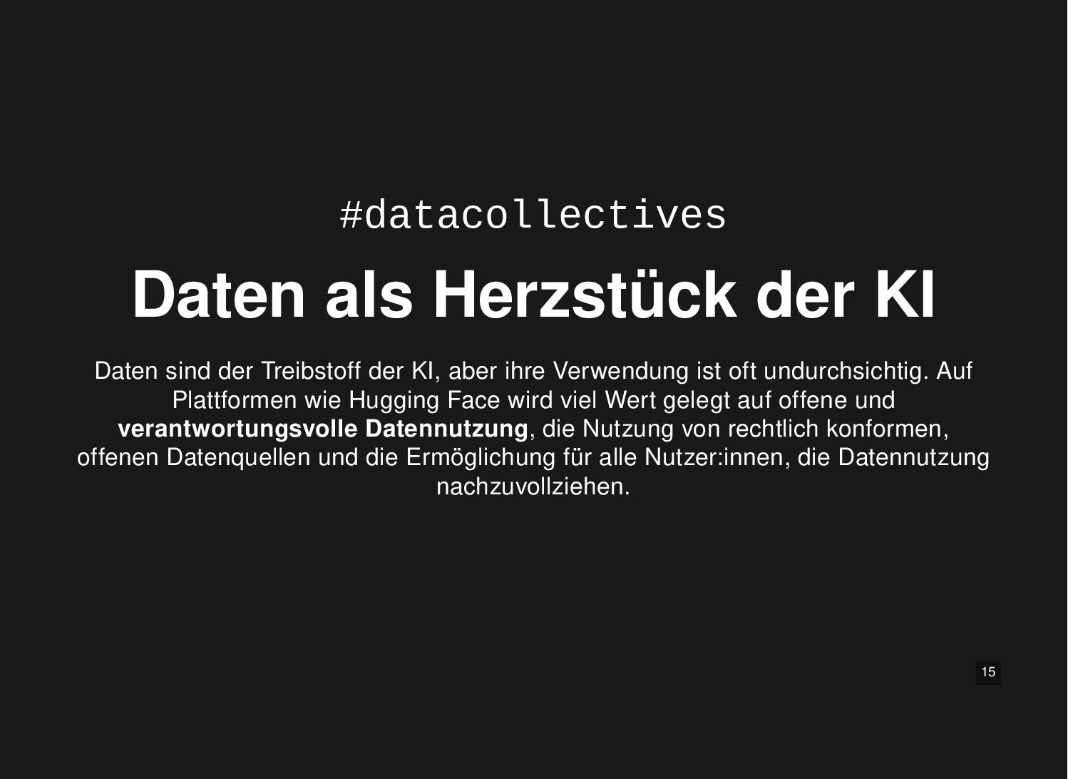 KI Daten sind der Treibstoff der KI, aber ihre Verwendung ist oft undurchsichtig. Auf Plattformen wie Hugging Face wird viel Wert gelegt auf offene und verantwortungsvolle Datennutzung, die Nutzung von rechtlich konformen, offenen Datenquellen und die Ermöglichung für alle Nutzer:innen, die Datennutzung nachzuvollziehen. 15