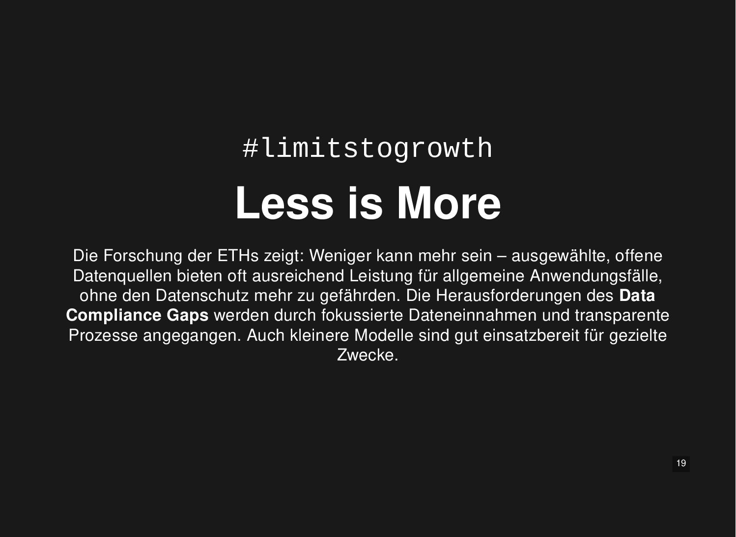 ETHs zeigt: Weniger kann mehr sein – ausgewählte, offene Datenquellen bieten oft ausreichend Leistung für allgemeine Anwendungsfälle, ohne den Datenschutz mehr zu gefährden. Die Herausforderungen des Data Compliance Gaps werden durch fokussierte Dateneinnahmen und transparente Prozesse angegangen. Auch kleinere Modelle sind gut einsatzbereit für gezielte Zwecke. 19