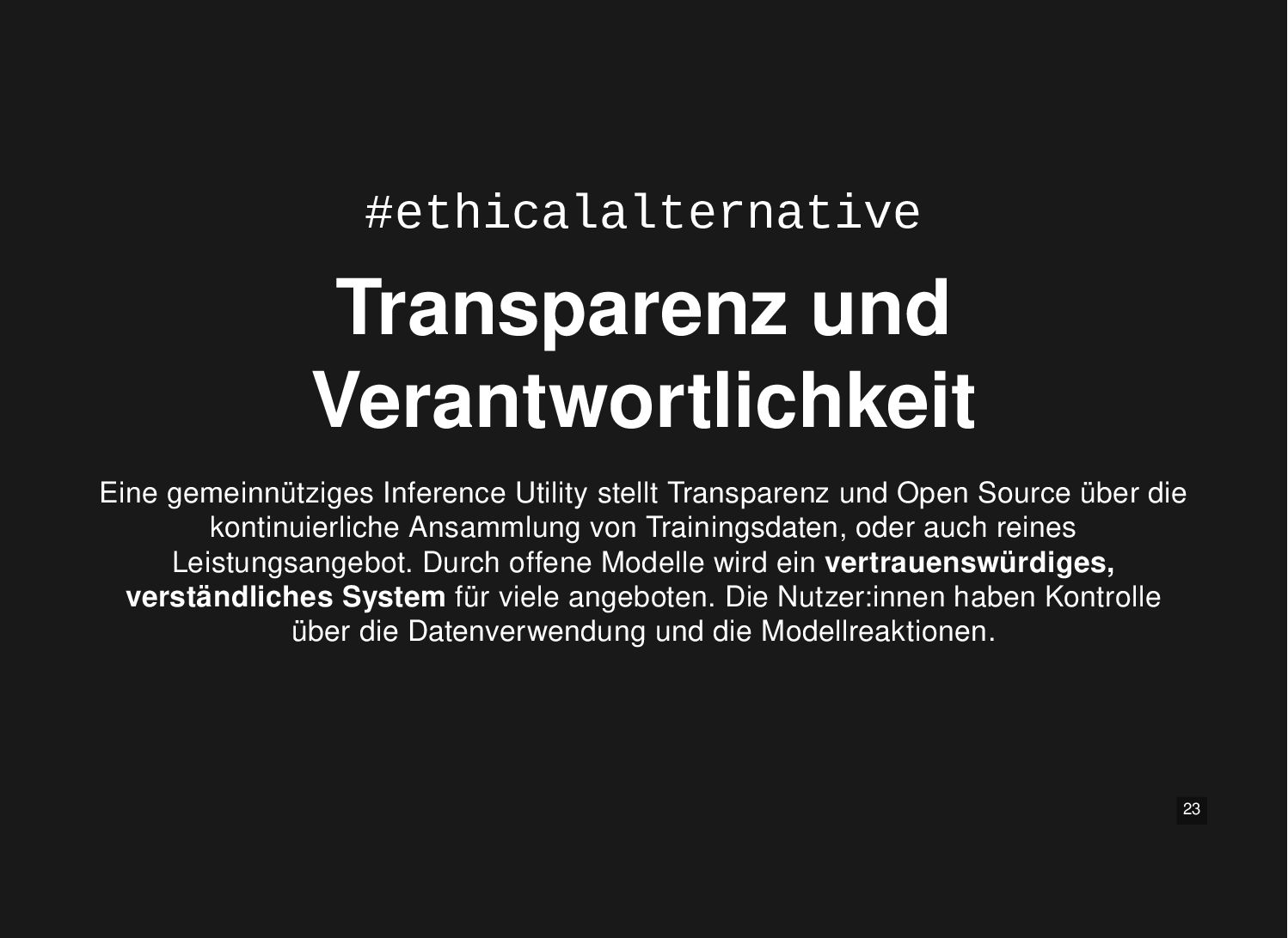 Utility stellt Transparenz und Open Source über die kontinuierliche Ansammlung von Trainingsdaten, oder auch reines Leistungsangebot. Durch offene Modelle wird ein vertrauenswürdiges, verständliches System für viele angeboten. Die Nutzer:innen haben Kontrolle über die Datenverwendung und die Modellreaktionen. 23