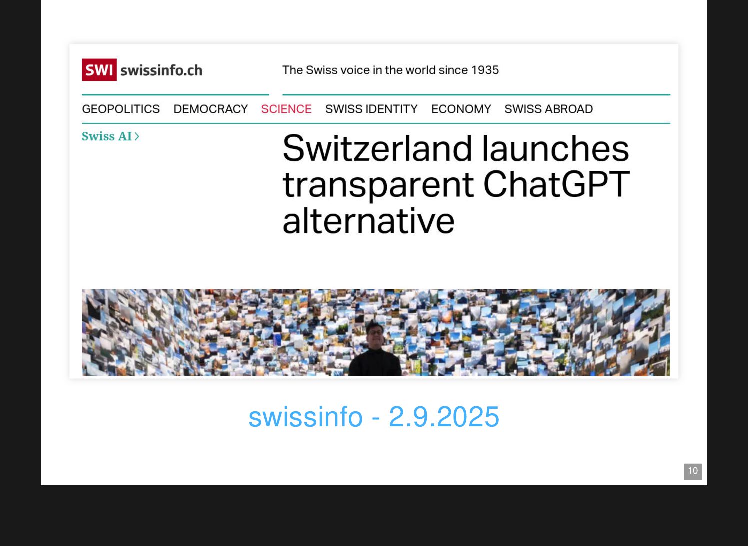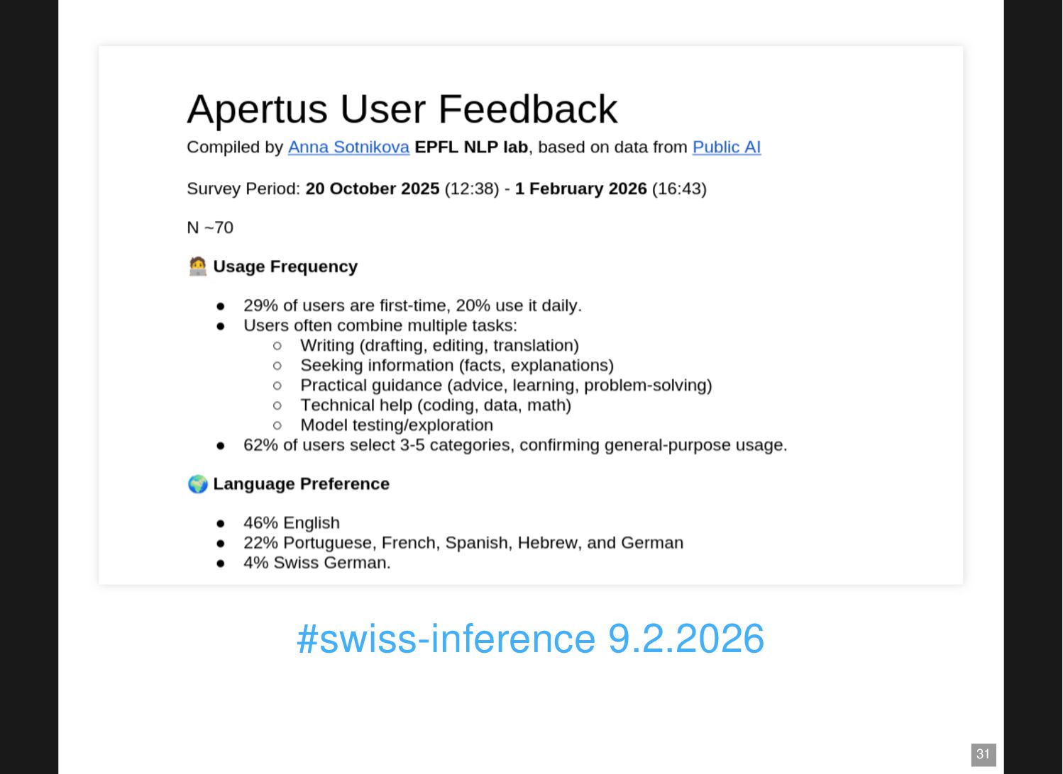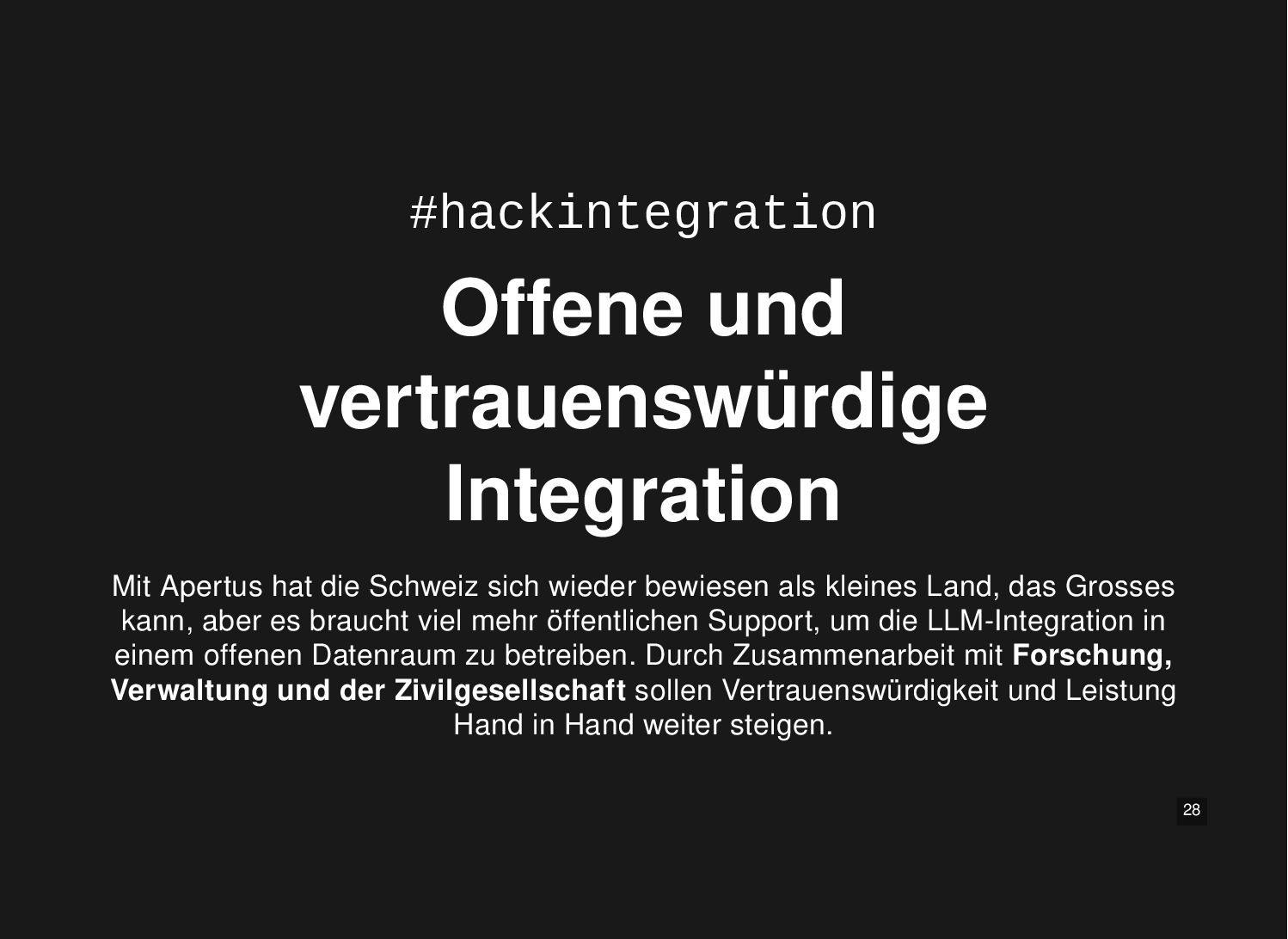 Apertus hat die Schweiz sich wieder bewiesen als kleines Land, das Grosses kann, aber es braucht viel mehr öffentlichen Support, um die LLM-Integration in einem offenen Datenraum zu betreiben. Durch Zusammenarbeit mit Forschung, Verwaltung und der Zivilgesellschaft sollen Vertrauenswürdigkeit und Leistung Hand in Hand weiter steigen. 28