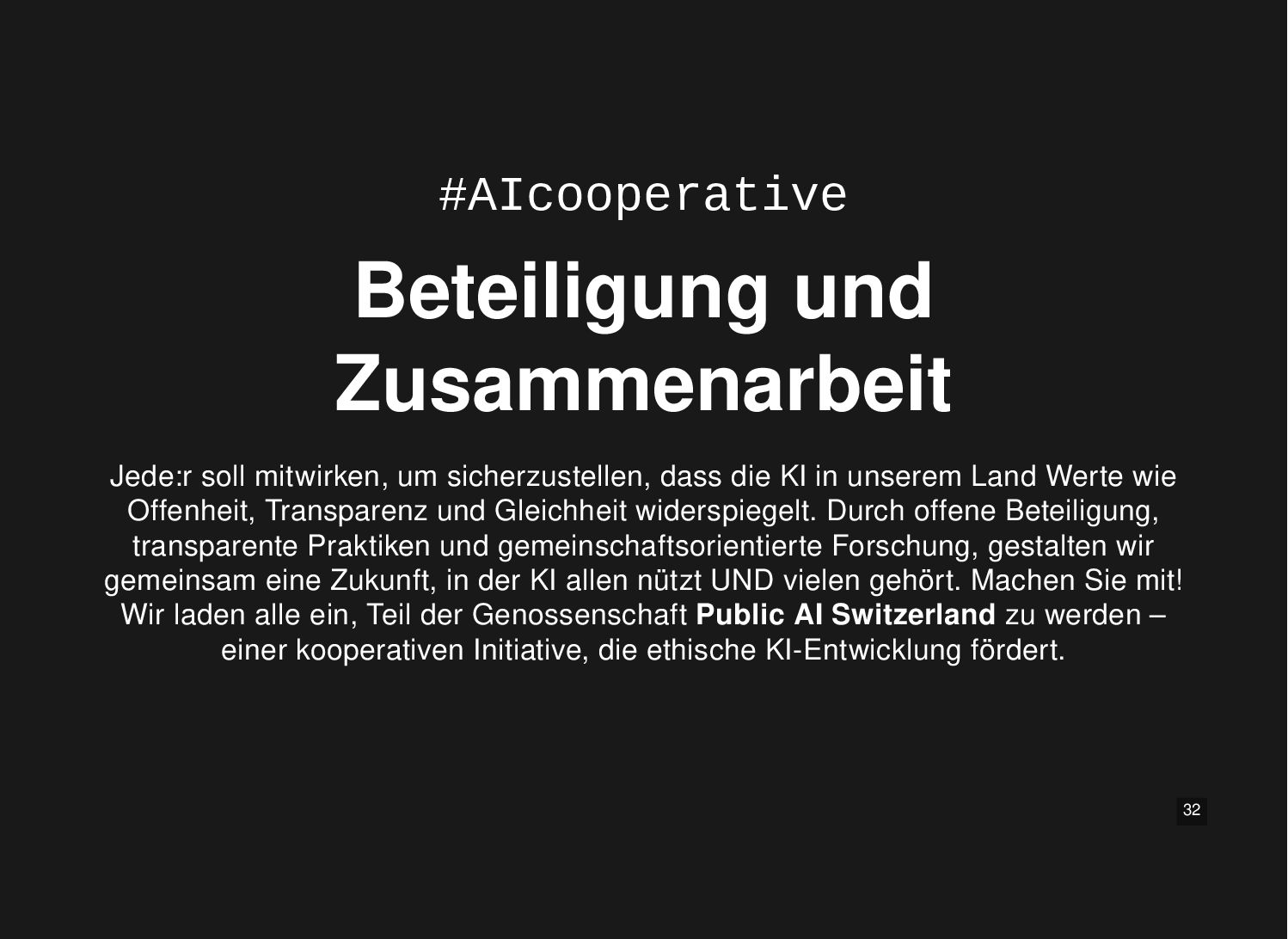 um sicherzustellen, dass die KI in unserem Land Werte wie Offenheit, Transparenz und Gleichheit widerspiegelt. Durch offene Beteiligung, transparente Praktiken und gemeinschaftsorientierte Forschung, gestalten wir gemeinsam eine Zukunft, in der KI allen nützt UND vielen gehört. Machen Sie mit! Wir laden alle ein, Teil der Genossenschaft Public AI Switzerland zu werden – einer kooperativen Initiative, die ethische KI-Entwicklung fördert. 32