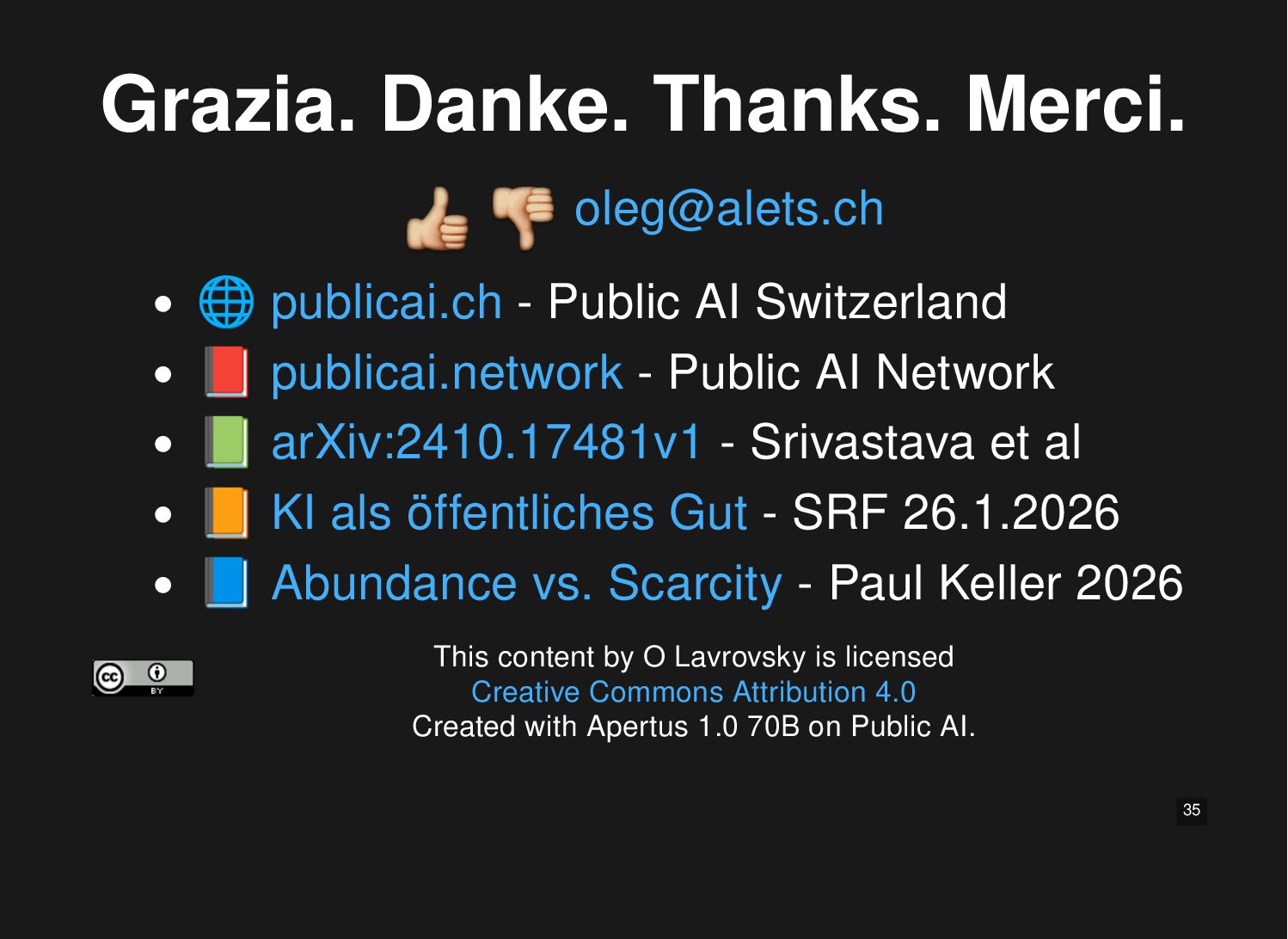 Public AI Switzerland • - Public AI Network • - Srivastava et al • - SRF 26.1.2026 • - Paul Keller 2026 This content by O Lavrovsky is licensed Created with Apertus 1.0 70B on Public AI. [email protected] publicai.ch publicai.network arXiv:2410.17481v1 KI als öffentliches Gut Abundance vs. Scarcity Creative Commons Attribution 4.0 35