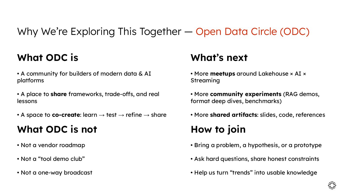 More community experiments (RAG demos, format deep dives, benchmarks) • More shared artifacts: slides, code, references • A community for builders of modern data & AI platforms • A place to share frameworks, trade-offs, and real lessons • A space to co-create: learn → test → refine → share What’s next What ODC is not • Not a vendor roadmap • Not a “tool demo club” • Not a one-way broadcast • Bring a problem, a hypothesis, or a prototype • Ask hard questions, share honest constraints • Help us turn “trends” into usable knowledge Why We’re Exploring This Together — Open Data Circle (ODC) What ODC is How to join