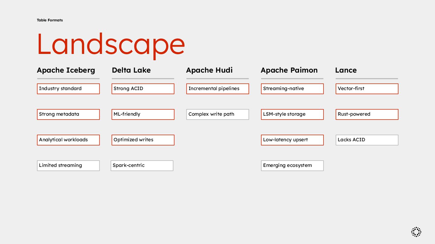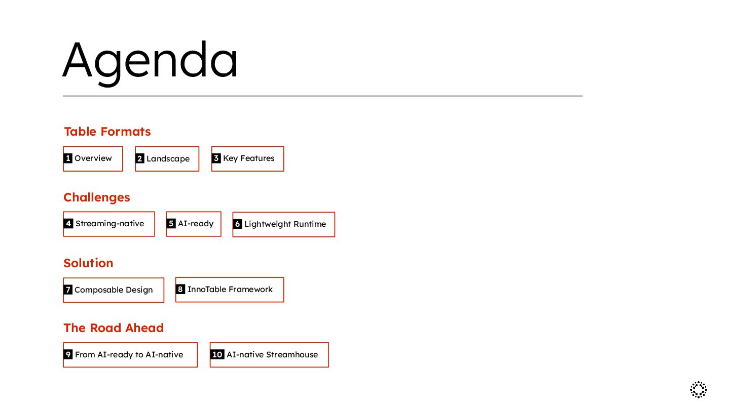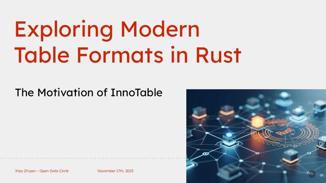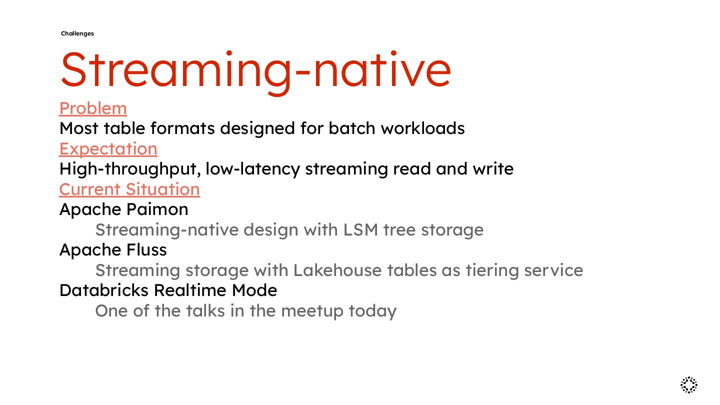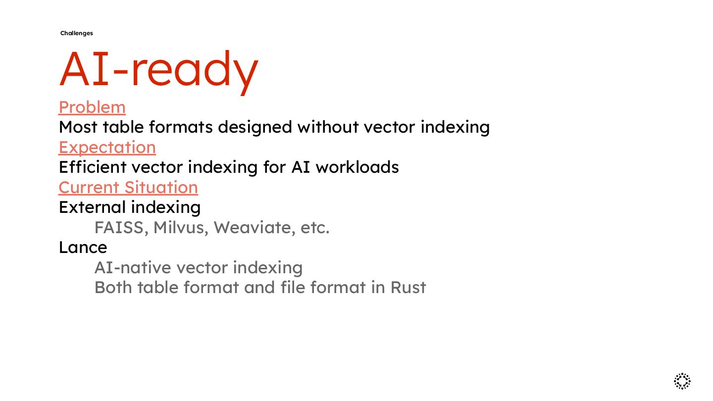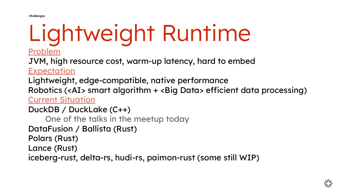 hard to embed Expectation Lightweight, edge-compatible, native performance Robotics (<AI> smart algorithm + <Big Data> efficient data processing) Current Situation DuckDB / DuckLake (C++) One of the talks in the meetup today DataFusion / Ballista (Rust) Polars (Rust) Lance (Rust) iceberg-rust, delta-rs, hudi-rs, paimon-rust (some still WIP)