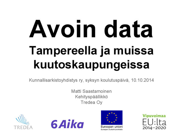 Espoo, Vantaa, Kauniainen • Tampereen seutu ◦ http://data.tampere.fi, 2012 ◦ Open Data Tampere Region, http://hermia.fi/opendatatre, 2013 • Jyväskylä, http://data.jyvaskyla.fi/, 2012 • Oulu, http://www.ouka.fi/oulu/oulu-tietoa/avoin-data, 2013 • Kuopio, http://www.kuopio.fi/web/kaupunkitietoa/avoin-data, 2013 • Turun seutu ◦ Lounaispaikka Open Data, http://opendata.lounaispaikka.fi, 2013 • Mikkeli, http://open.mikkeli.fi/, 2014 • Mahdollisesti käynnistyvää toimintaa ainakin Lappeenrannassa, Porissa, Rovaniemellä, Hämeenlinnassa, ... Avoin data Suomen kunnissa