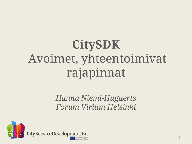 kaupungeissa • ‘Avoimet’ rajapinnat olemassa oleviin järjestelmiin eivät ole yhteneviä edes kaupunkien sisällä • Dokumentaatiokin usein uupuu Sovellusten vieminen kaupungista toiseen =