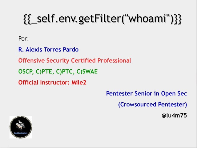 net. Web App hunting {{_self.env.getFilter("whoami")}} {{_self.env.getFilter("whoami")}} Por: R. Alexis Torres Pardo Offensive Security Certified Professional OSCP, C)PTE, C)PTC, C)SWAE Official Instructor: Mile2 Pentester Senior in Open Sec (Crowsourced Pentester) @lu4m75