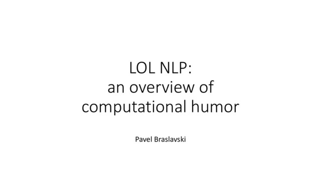 Investigations in automatic humor recognition. HLT-EMNLP2005. • Oliviero Stock, Carlo Strapparava. HAHAcronym: A Computational Humor System. ACL demo 2005. • Alessandro Valitutti, Hannu Toivonen, Antoine Doucet, Jukka M. Toivanen. “Let Everything Turn Well in Your Wife”: Generation of Adult Humor Using Lexical Constraints. ACL2013. • Dafna Shahaf, Eric Horvitz, and Robert Mankoff. Inside jokes: Identifying humorous cartoon captions. PKDD2015. • Diyi Yang, Alon Lavie, Chris Dyer, and Eduard Hovy. Humor recognition and humor anchor extraction. EMNLP2015. • Peter Potash, Alexey Romanov, Anna Rumshisky. SemEval-2017 Task 6: #HashtagWars: Learning a Sense of Humor. SEMEVAL2017. • Tristan Miller, Christian F. Hempelmann, and Iryna Gurevych. SemEval-2017 Task 7: Detection and Interpretation of English Puns. SEMEVAL2017. • Vladislav Blinov, Kirill Mishchenko, Valeria Bolotova, Pavel Braslavski. A Pinch of Humor for Short-Text Conversation: an Information Retrieval Approach. CLEF2017. • Anton Ermilov, Natasha Murashkina, Valeria Goryacheva, and Pavel Braslavski. Stierlitz Meets SVM: Humor Detection in Russian. AINL2018. • Pavel Braslavski, Vladislav Blinov, Valeria Bolotova, Katya Pertsova. How to Evaluate Humorous Response Generation, Seriously? CHIIR2018. • Vladislav Blinov, Valeriia Bolotova-Baranova, Pavel Braslavski. Large Dataset and Language Model Fun-Tuning for Humor Recognition. ACL2019. • He He, Nanyun Peng, Percy Liang. Pun Generation with Surprise. NAACL2019. • Orion Weller, Kevin Seppi. Humor Detection: A Transformer Gets the Last Laugh. EMNLP2019. • Nabil Hossain, John Krumm, Michael Gamon. “President Vows to Cut <Taxes> Hair”: Dataset and Analysis of Creative Text Editing for Humorous Headlines. NAACL2019. • Robert West, Eric Horvitz. Reverse-Engineering Satire, or “Paper on Computational Humor Accepted despite Making Serious Advances”. AAAI2019. 24
