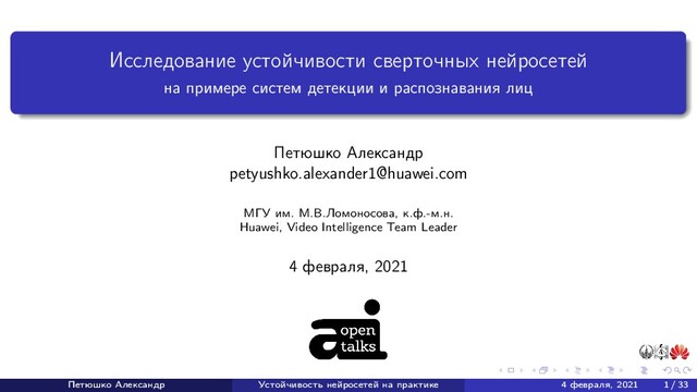 состязательные примеры для СНС формулируются в терминах ∞-нормы (что соответствует процессу восприятия человеческим глазом визуальной информации) ||x||∞ = max i |xi |, x = (x1, . . . , xn) ∈ Rn Fast Gradient Sign Method10 (FGSM): r = · sign(∇x L(θ, x, y)) Итеративный FGSM (I-FGSM)11 / Projected Gradient Descent (PGD)12 (где ΠB операция проекции на B): xt+1 = ΠB(xt + α · sign ∇x L(θ, xt, y)), x0 = x, α = /T, t ≤ T Сглаживание градиента для I-FGSM (MI-FGSM): gt+1 = µ · gt + ∇x L(θ,xt ,y) ||∇x L(θ,xt ,y)||1 , xt+1 = ΠB(xt + α · sign(gt+1)), x0 = x, g0 = 0 10Goodfellow I. et al. “Explaining and harnessing adversarial examples.” 2014 11Kurakin A. et al. “Adversarial examples in the physical world.” 2016 12Madry A. et al. “Towards deep learning models resistant to adversarial attacks.” 2017 Петюшко Александр Устойчивость нейросетей на практике 4 февраля, 2021 8 / 33