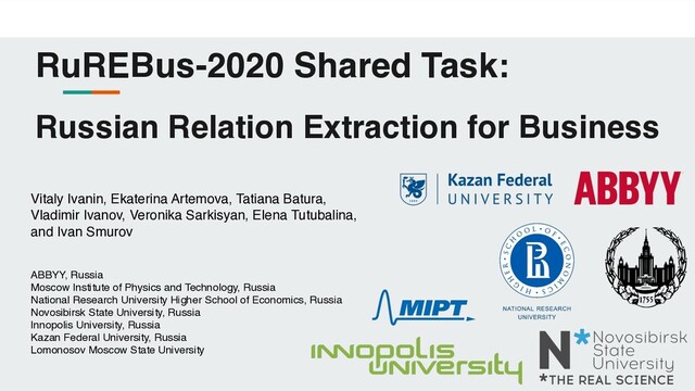 Batura, Vladimir Ivanov, Veronika Sarkisyan, Elena Tutubalina, and Ivan Smurov ABBYY, Russia Moscow Institute of Physics and Technology, Russia National Research University Higher School of Economics, Russia Novosibirsk State University, Russia Innopolis University, Russia Kazan Federal University, Russia Lomonosov Moscow State University RuREBus-2020 Shared Task: