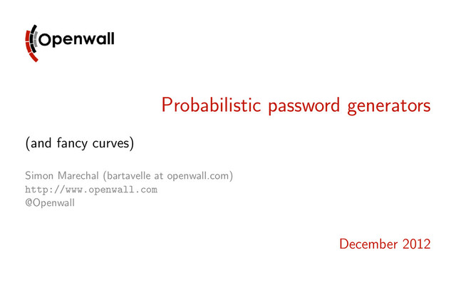 empty reduced state, ψ = 100, length budget of 10, and nbparts = ∅. The full state is (∅, 100, 10) 2. The list of acceptable next reduced states is (a, 6), (b, 13), (c, 13) 3. Start with (a, 6). The next full state is (a, 94, 9). It is not in nbparts, so the algorithm keeps going 4. Continue until the length or budget is depleted 5. Store the password count related to this node in nbparts With this training set, 621 nodes will be generated, and the result will be 58314 passwords S. Marechal (Openwall) Probabilistic password generators December 2012 13 / 34