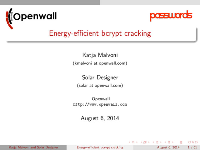 P1, P2, P3, P4 and tmpa1, L0, c1 lsr tmpa3, L0, 0xe and tmpa3, tmpa3, c2 lsr tmpa4, L0, 0x16 and tmpa4, tmpa4, c2 imul tmpa1, tmpa1, c3 ldr tmpa3, [S01, +tmpa3] ldr tmpa4, [S00, +tmpa4] lsr tmpa2, L0, 6 and tmpa2, tmpa2, c2 iadd tmpa3, tmpa4, tmpa3 ldr tmpa2, [S02, +tmpa2] ldr tmpa1, [S03, +tmpa1] lsr tmpb4, L1, 0x18 eor R0, R0, \P1 eor tmpa3, tmpa2, tmpa3 imul tmpb4, tmpb4, c3 and tmpb1, L1, c1 lsr tmpb3, L1, 0xe and tmpb3, tmpb3, c2 iadd tmpa3, tmpa3, tmpa1 imul tmpb1, tmpb1, c3 ldr tmpb3, [S11, +tmpb3] ldr tmpb4, [S10, +tmpb4] lsr tmpa1, L1, 6 and tmpa1, tmpa1, c2 eor R0, R0, tmpa3 iadd tmpb3, tmpb4, tmpb3 ldr tmpa1, [S12, +tmpa1] ldr tmpb1, [S13, +tmpb1] lsr tmpa4, R0, 0x18 eor R1, R1, \P3 eor tmpb3, tmpa1, tmpb3 imul tmpa4, tmpa4, c3 and tmpa1, R0, c1 lsr tmpa3, R0, 0xe and tmpa3, tmpa3, c2 iadd tmpb3, tmpb3, tmpb1 imul tmpa1, tmpa1, c3 ldr tmpa3, [S01, +tmpa3] ldr tmpa4, [S00, +tmpa4] lsr tmpa2, R0, 6 and tmpa2, tmpa2, c2 eor R1, R1, tmpb3 iadd tmpa3, tmpa4, tmpa3 ldr tmpa2, [S02, +tmpa2] ldr tmpa1, [S03, +tmpa1] lsr tmpb4, R1, 0x18 eor L0, L0, \P2 eor tmpa3, tmpa2, tmpa3 imul tmpb4, tmpb4, c3 and tmpb1, R1, c1 lsr tmpb3, R1, 0xe and tmpb3, tmpb3, c2 iadd tmpa3, tmpa3, tmpa1 ldr tmpb3, [S11, +tmpb3] ldr tmpb4, [S10, +tmpb4] imul tmpb1, tmpb1, c3 lsr tmpa1, R1, 6 and tmpa1, tmpa1, c2 iadd tmpb3, tmpb4, tmpb3 eor L0, L0, tmpa3 ldr tmpa1, [S12, +tmpa1] eor L1, L1, \P4 ldr tmpb1, [S13, +tmpb1] eor tmpb3, tmpa1, tmpb3 add tmpb3, tmpb3, tmpb1 eor L1, L1, tmpb3 .endm Katja Malvoni and Solar Designer Energy-efficient bcrypt cracking August 6, 2014 15 / 61
