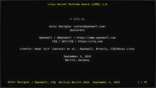 Linux Kernel Runtime Guard (LKRG) is a Linux kernel module that performs runtime integrity checking of the kernel and detection of security vulnerability exploits against the kernel, prevention of and response to successful attacks, and encrypted remote logging. The project was founded by Adam 'pi3' Zabrocki, who invited Solar Designer to join and we released version 0.0 publicly in 2018 under Openwall umbrella (announced as Openwall's most controversial project to date). We have been extending and maintaining it since (as an independent project supported at various times by Binarly and CIQ). While we had a userbase using it in production (and did so ourselves) during all this time, now we're finally ready to call it mature and release 1.0.