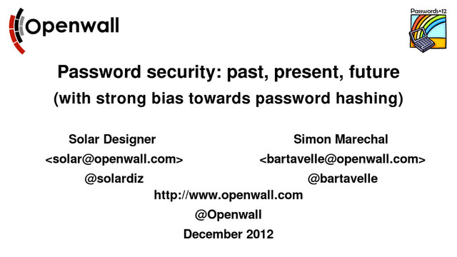 In this presentation, we start by providing some historical background on password hashing (since 1970s), show how today's password hashing methods are different yet similar, and finally propose how future password hashing methods may be designed. We also briefly touch related topics such as password policy, rainbow tables, GPUs, multi-factor authentication, and we show how passwords (or rather passphrases) will remain relevant for many years to come.