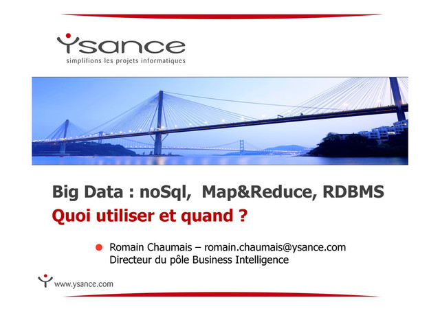 Source : http://blog.nahurst.com A P C Partition tolerance means that the system works well across physical network partitions Consistency means that each client always has the same view of the data Availability means that all clients can always read and write Pick only 2 CA AP CP • RDBMSs (Oracle, SQLServer, MySQL) • Teradata, Exadata, Netezza, Fast Track • Vertica, Greenplum, InfiniDB • Azure Table Storage • BigTable, Hypertable, Hbase, • Hive, Aster Data • MongoDB, Terrastore • Scalaris, Berkeley DB, MemcacheDB • Redis, Scalaris • Dynamo, Voldemort, Tokyo Cabinet, KAI • SimpleDB, CouchDB, Riak • Cassandra, Data Models • Relational • Relational MPP • Key - Value • Column Oriented / Tabular • Document Oriented Big Data : architecture alternative