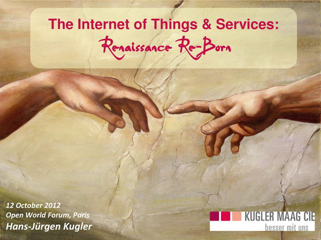 Re-Born • The Internet of Things and Services comes at the right time. Waves of open initiatives discover that community values harmonize with sustainable eco-systems. The Internet of Things and Services will connect these wave to a tide that will wash away some of the dogmatic relics of the industrial revolution. • We are entering the creative age. Acceptance of diversity, trust, empowerment, empathy and a shared purpose are the foundations for healthy organizations, large or small. With the Internet of Things and Services we can really democratize the productive resources without "exclusion zones." We need help from all walks of life, from all disciplines. Together we can change society. The Second Renaissance has begun. [http://2renaissance.org]
