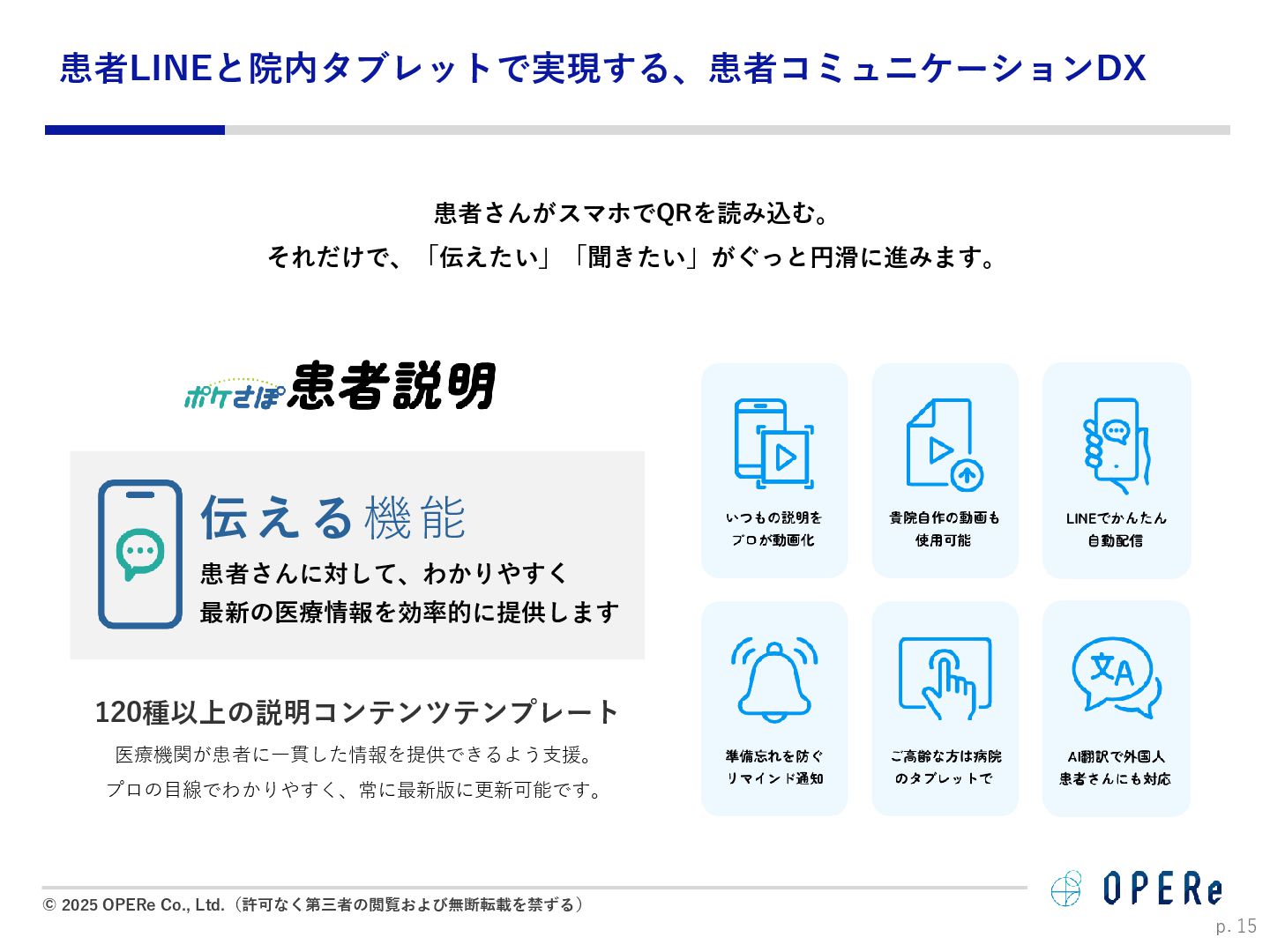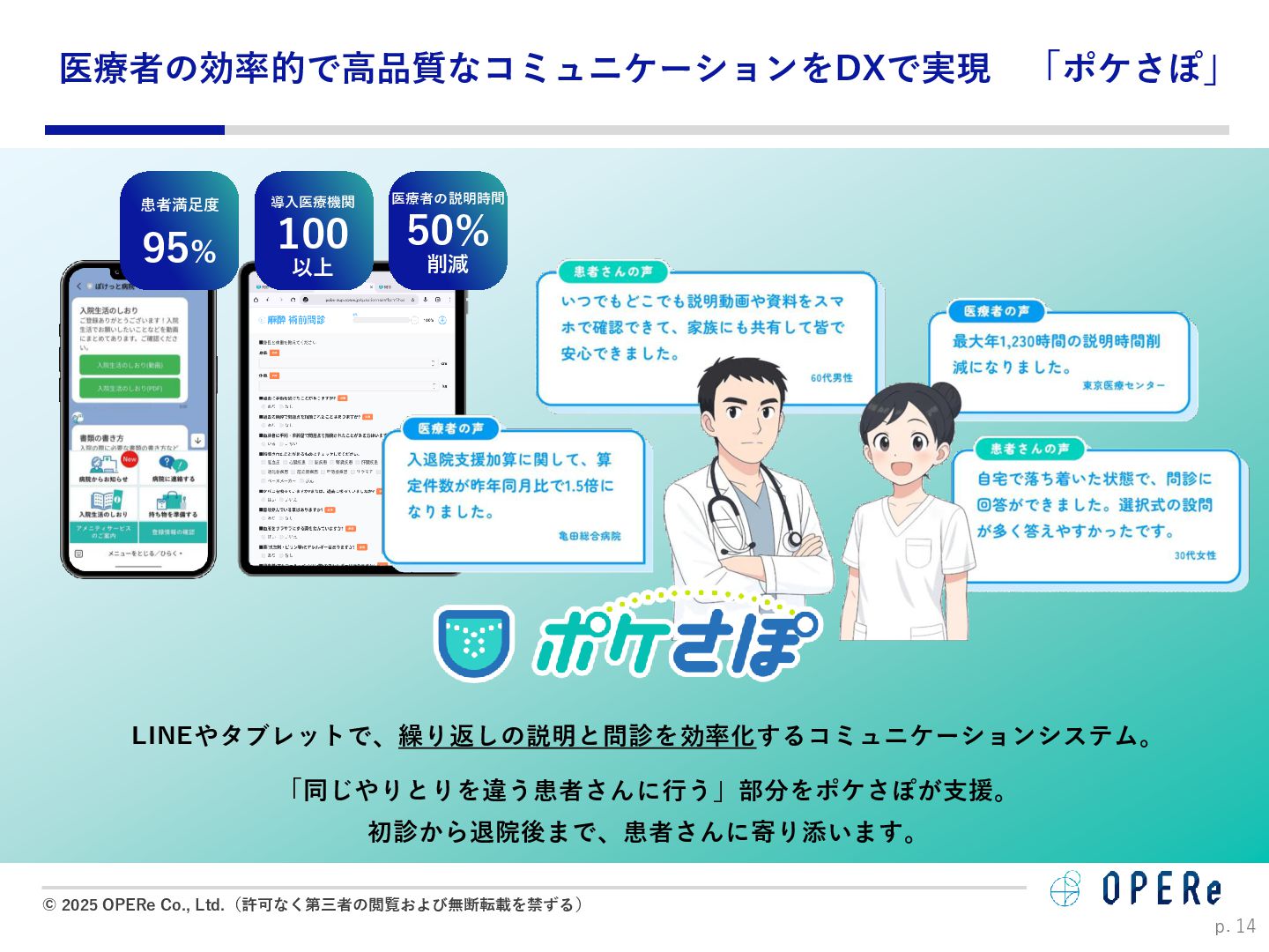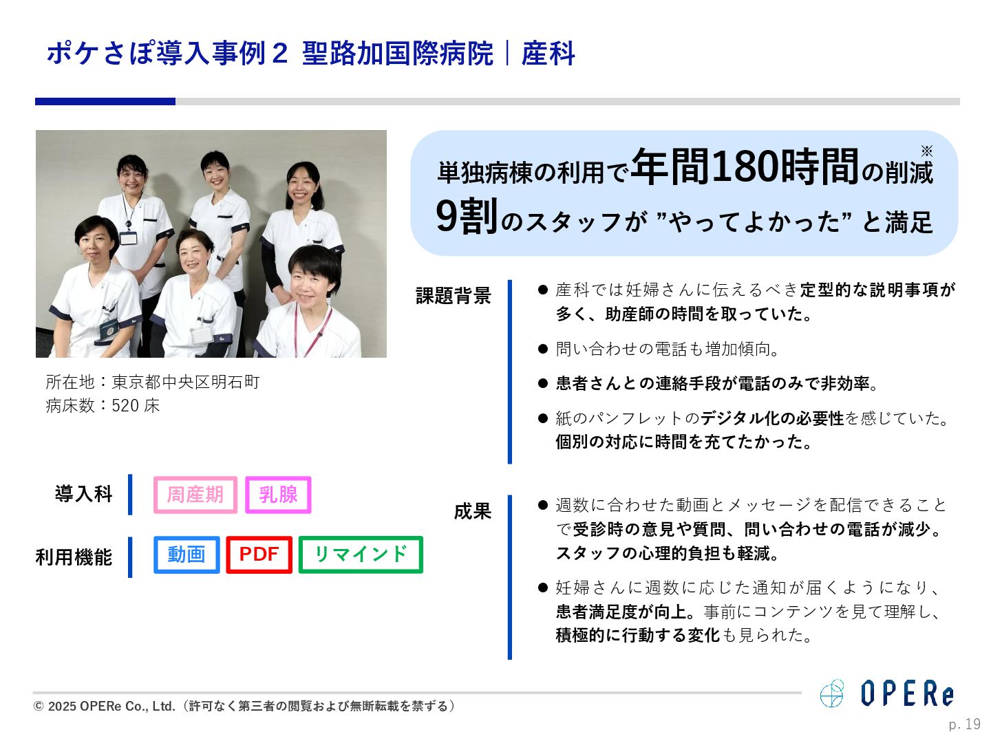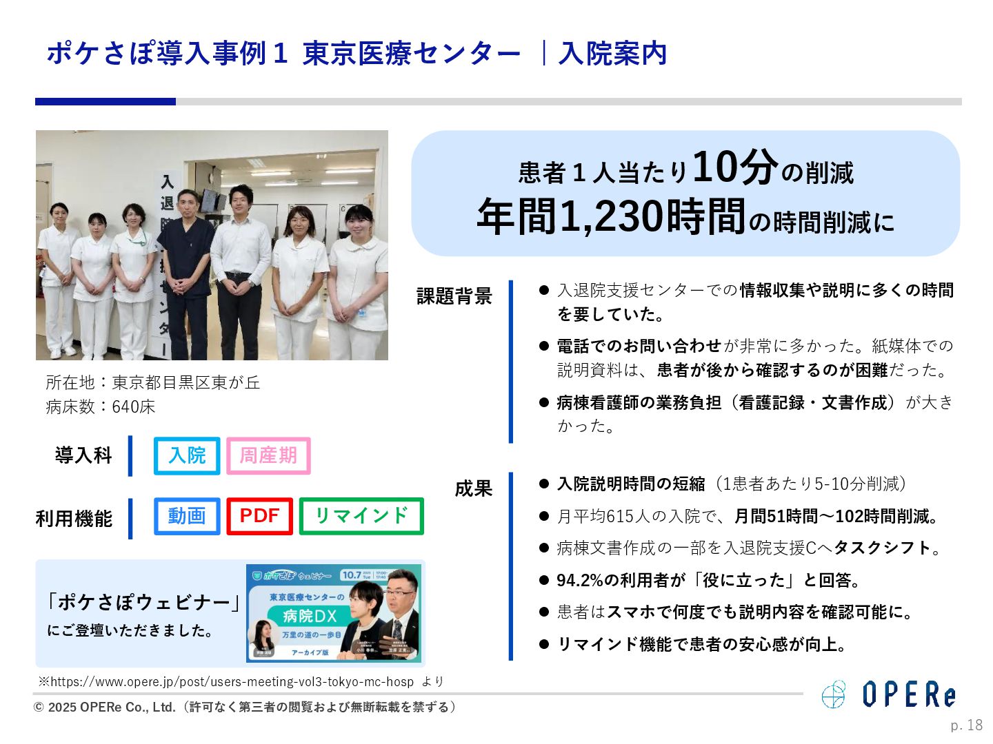 病床数:640床 課題背景 ⚫ 入退院支援センターでの情報収集や説明に多くの時間 を要していた。 ⚫ 電話でのお問い合わせが非常に多かった。紙媒体での 説明資料は、患者が後から確認するのが困難だった。 ⚫ 病棟看護師の業務負担(看護記録・文書作成)が大き かった。 ⚫ 入院説明時間の短縮(1患者あたり5-10分削減) ⚫ 月平均615人の入院で、月間51時間〜102時間削減。 ⚫ 病棟文書作成の一部を入退院支援Cへタスクシフト。 ⚫ 94.2%の利用者が「役に立った」と回答。 ⚫ 患者はスマホで何度でも説明内容を確認可能に。 ⚫ リマインド機能で患者の安心感が向上。 患者1人当たり 10分の削減 年間1,230時間の時間削減に ※https://www.opere.jp/post/users-meeting-vol3-tokyo-mc-hosp より 成果 動画 PDF リマインド 利用機能 入院 周産期 導入科 p. 18 「ポケさぽウェビナー」 にご登壇いただきました。