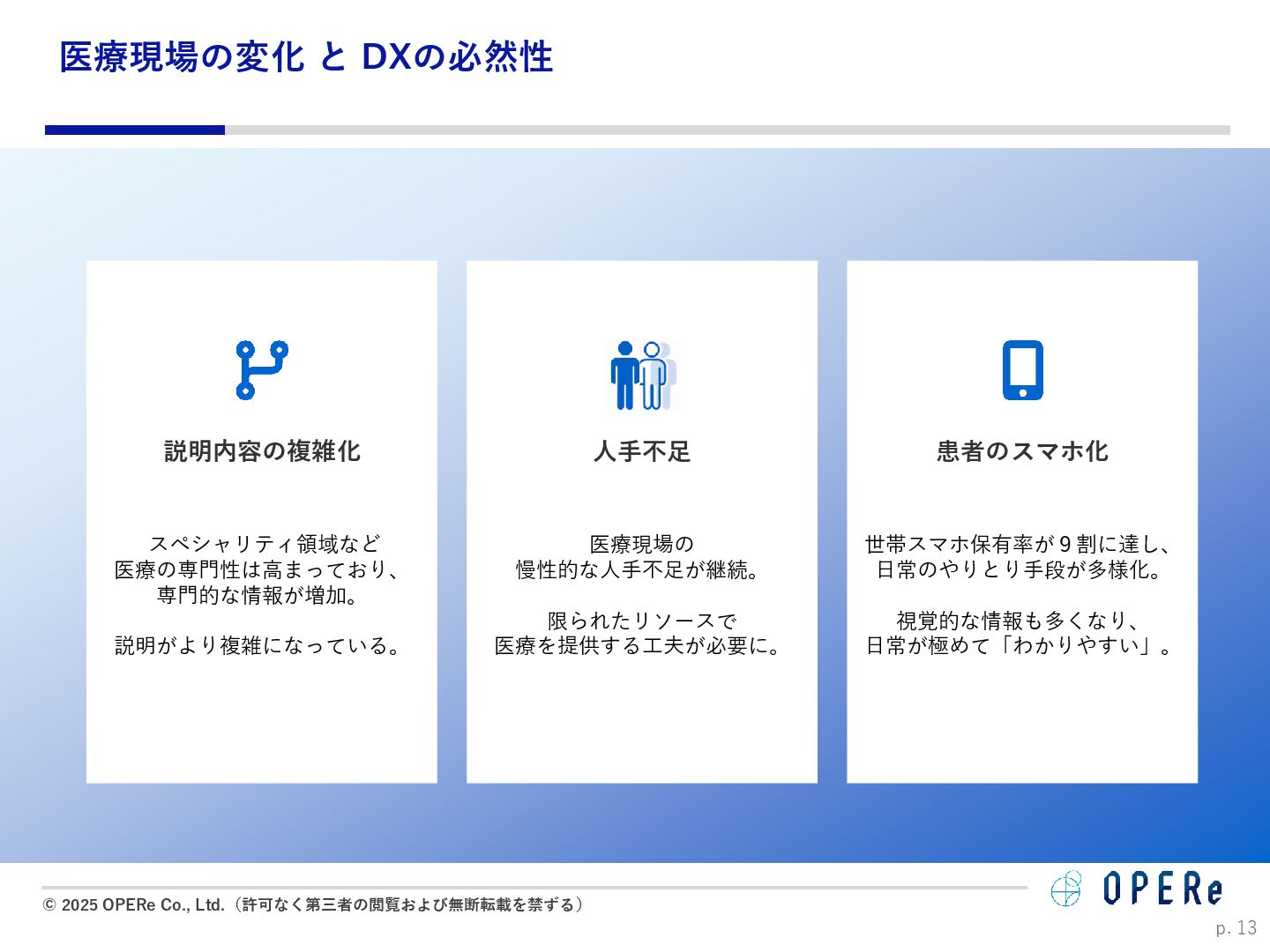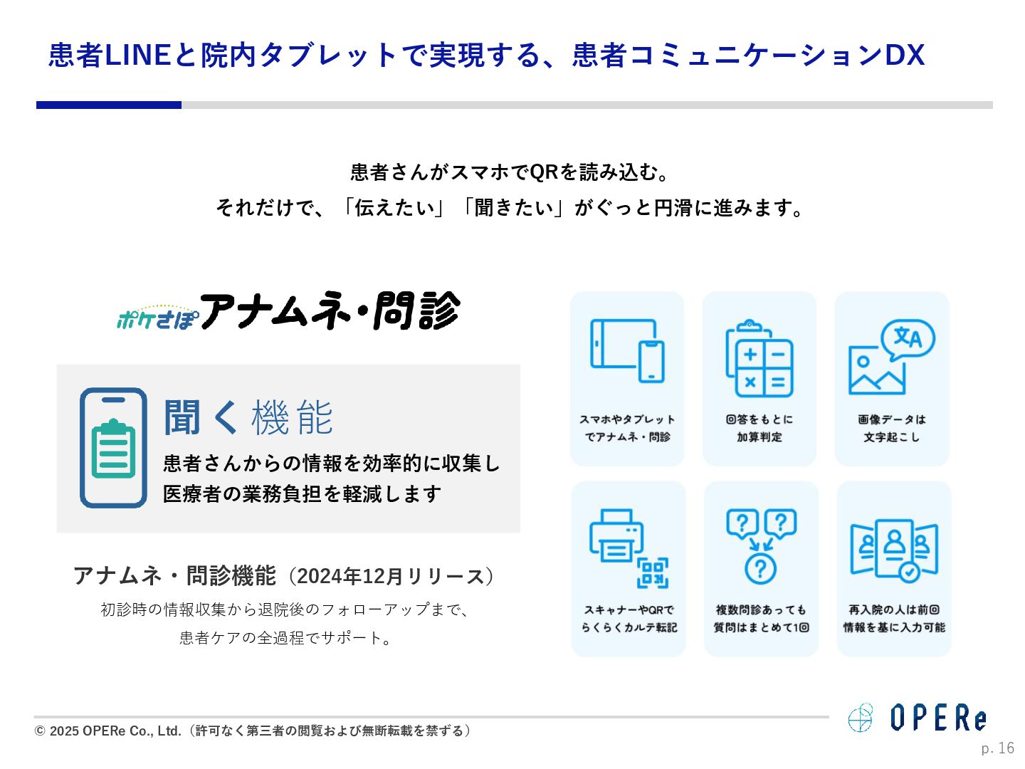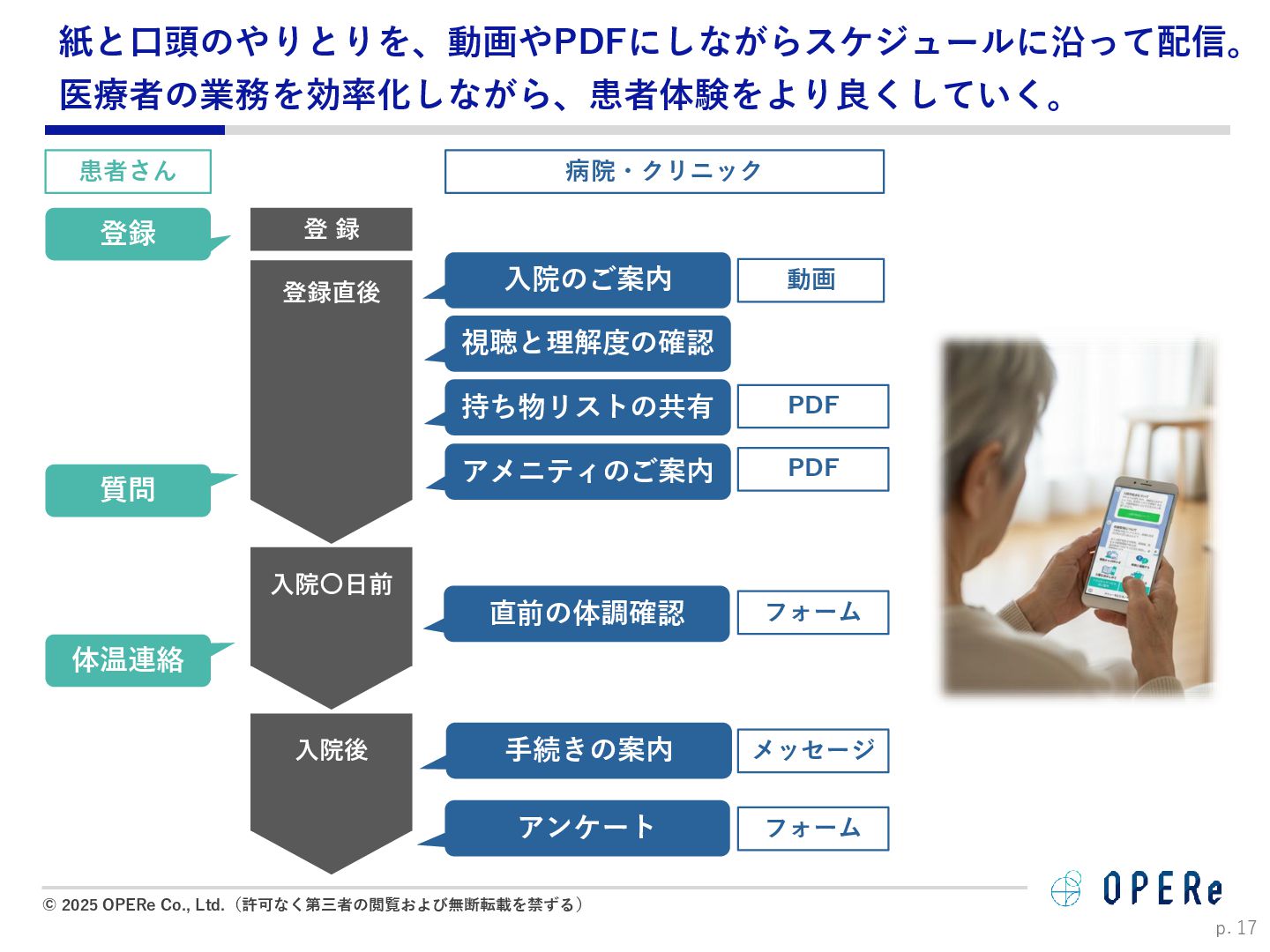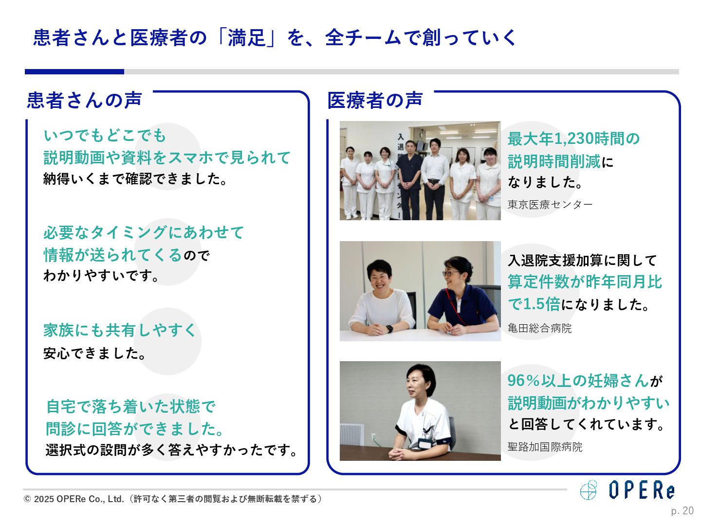病床数:640床 課題背景 ⚫ 入退院支援センターでの情報収集や説明に多くの時間 を要していた。 ⚫ 電話でのお問い合わせが非常に多かった。紙媒体での 説明資料は、患者が後から確認するのが困難だった。 ⚫ 病棟看護師の業務負担(看護記録・文書作成)が大き かった。 ⚫ 入院説明時間の短縮(1患者あたり5-10分削減) ⚫ 月平均615人の入院で、月間51時間〜102時間削減。 ⚫ 病棟文書作成の一部を入退院支援Cへタスクシフト。 ⚫ 94.2%の利用者が「役に立った」と回答。 ⚫ 患者はスマホで何度でも説明内容を確認可能に。 ⚫ リマインド機能で患者の安心感が向上。 患者1人当たり 10分の削減 年間1,230時間の時間削減に ※https://www.opere.jp/post/users-meeting-vol3-tokyo-mc-hosp より 成果 動画 PDF リマインド 利用機能 入院 周産期 導入科 p. 18 「ポケさぽウェビナー」 にご登壇いただきました。