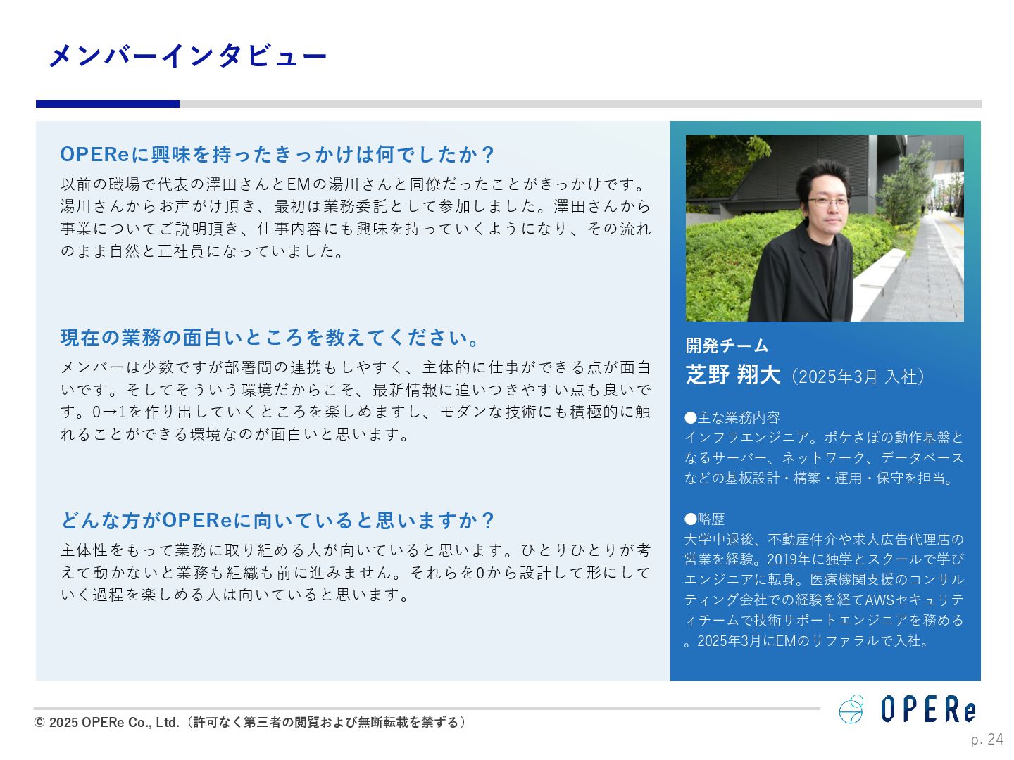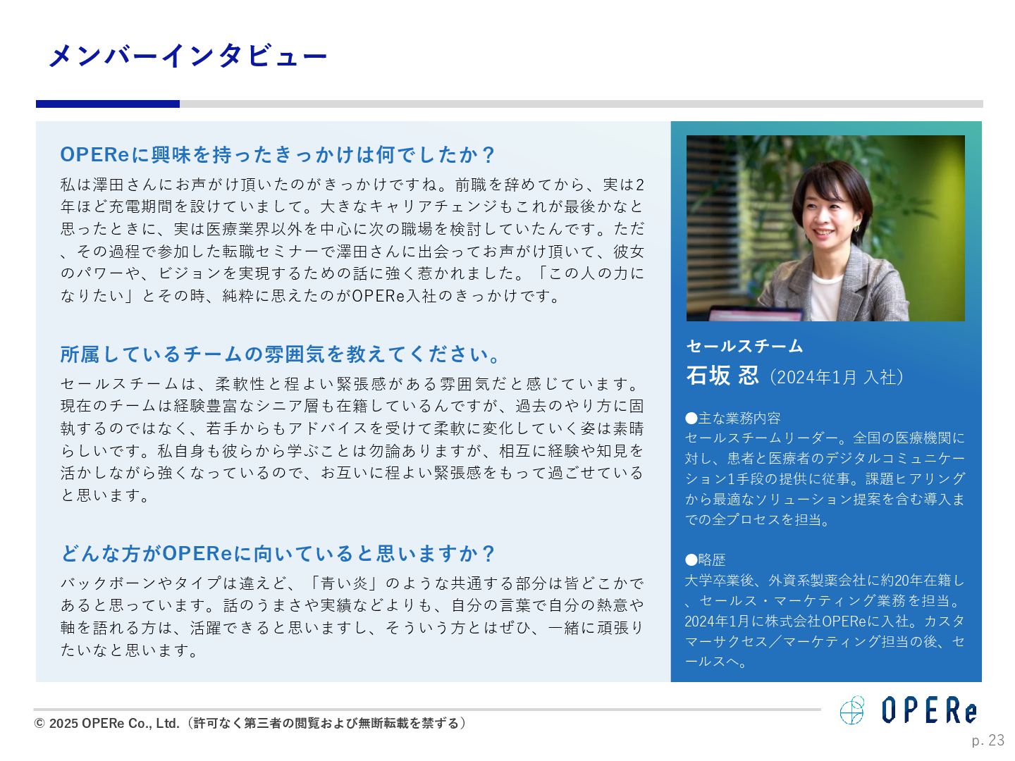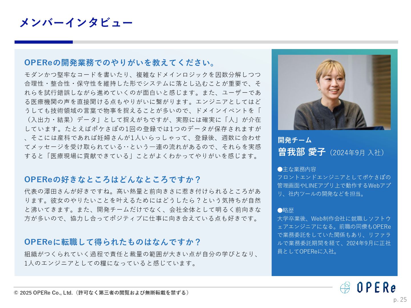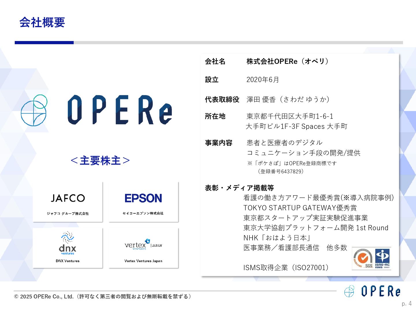 病床数:640床 課題背景 ⚫ 入退院支援センターでの情報収集や説明に多くの時間 を要していた。 ⚫ 電話でのお問い合わせが非常に多かった。紙媒体での 説明資料は、患者が後から確認するのが困難だった。 ⚫ 病棟看護師の業務負担(看護記録・文書作成)が大き かった。 ⚫ 入院説明時間の短縮(1患者あたり5-10分削減) ⚫ 月平均615人の入院で、月間51時間〜102時間削減。 ⚫ 病棟文書作成の一部を入退院支援Cへタスクシフト。 ⚫ 94.2%の利用者が「役に立った」と回答。 ⚫ 患者はスマホで何度でも説明内容を確認可能に。 ⚫ リマインド機能で患者の安心感が向上。 患者1人当たり 10分の削減 年間1,230時間の時間削減に ※https://www.opere.jp/post/users-meeting-vol3-tokyo-mc-hosp より 成果 動画 PDF リマインド 利用機能 入院 周産期 導入科 p. 18 「ポケさぽウェビナー」 にご登壇いただきました。