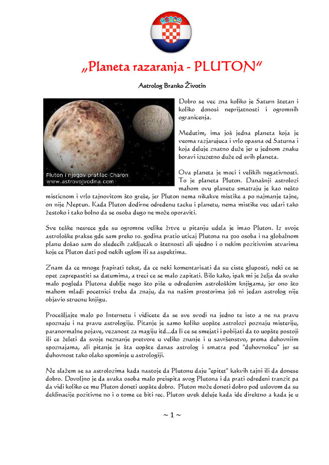 uopšte i deluje a ako i deluje to ce biti iskljucivo osobama Škorpijske i Marsove osobine,na druge ne deluje. Pluton donosi sve one mracne sile koji su povezani sa svakim zlom, predstavlja razne masakre, masovna uništenja, silovanje sa posledicama, grobove, smetilište, ubistva, kriminal, lopovluk, leš, ubice, sex, pedofilizam, neizlecive bolesti, anal, AIDS, virusna oboljenja, ginekologiju, operacije, nuklearna naoružanja, teroristi, paraformalna vojska, radioaktivni odpad, prodaja doge, oružija, roblje, teške psovke, napadi žestoki, isceljitestvo, mrtve duše, crna magija, polni organ, tumori, Hronološki gledajuci na globalnom planu tacno se moglo prepostaviti gde je i kada ce Pluton delovati a kada nema nikakav uticaj. treba gledati ujedno i u kom se znaku nalazi jer nije isto ako se nade u Škorpiji u svom sedištu ili u Ovnu kada mu je destvo znatno loše i gde donosi onda samo negativno. Ja cu delimicno obuhvati hronološki Plutona sa nekim odredenim znacima a na vama je da sve to "proverite" delovace zastrašujuce ali je "istinito". 07. 10. 1937. god u 13: 13:40 min Pluton je ušao u znak Lava gde se nalazi u Egzilu. Lav kao znak je najvljivao vlast a Pluton jednu surovost i monstruoznost. Kada se nade na 2 stepenu donosi velike pohlepnosti, želju za otimanjem, posedovanjem. Tada Pluton ne bira nikakva sredstva on oduzima i to tako primetno, silovito, gde raspolaže tada sa svim svojim snagama. Pošto je Lav fiksni znak i ono predstavlja ljude na vlasti jer Lavom vlada planeta Sunce a Pluton predstavlja masovnu silu, u kombinaciji sa Suncen, Marsom i Plutonom i Saturnom kada se nadu u kvadratu, garantujem da Pluton tada katastrofalno deluje. Evo primera nekog ili možete i sami malo izraditi kartu pa proveravati. Tacno 01.09.1939. godine Pluton je dostigao drugi stepen Lava gde je bio u jakom kvadratu sa fiksnom zvezdom 2.stepena i 59 minuta Sheratan u Biku a Saturn je upravo ušao u Biku. Sama fiksna zvezda ima znacenje Marsa i saturna i ona donosi vrlo loše. Tacno 01.09.1939. godine Adolf Hitler, Nemacka je bombardovala Poljsku a nakon samo dva dana od bombardovanja Poljska, Velika Britanija i Franciska su objavili Nemackoj rat. Rat koji je vodila Poljska i koliko žrtava je bilo tipicno je za Plutona (masovno) stradanje. Rat koji je trajao do 1945. godine zasigurno je jedno da je istorijski zabeleženo. Žrtava se ni danas ne zna broj. Treba se pogledati horoskop i samog Hitlera 21.04.1889 u 18:30 Long: 13E02 lat: 48N15 gde mu je podznak na 6 stepenu i 53 minuta u Škorpiji a Pluton i Mars mu u 7. kuci a to je kuca koja govori o ratu. Pluton mu se nalazi na 4. stepenu Blizanaca a Mars u Biku pa nije ni cudno zašto je ovaj monstrum imao nalete besa, padanje u trans, želju za vlašcu, želju za osvajanje, sve pod uticajem Plutona jer sam je bio u podznaku Škorpija.
