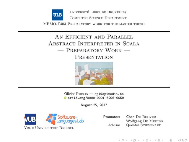 work for the master thesis An Efficient and Parallel Abstract Interpreter in Scala — Preparatory Work — Presentation Olivier Pirson — [email protected] orcid.org/0000-0001-6296-9659 August 25, 2017 Vrije Universiteit Brussel Promotors Coen De Roover Wolfgang De Meuter Advisor Quentin Stievenart