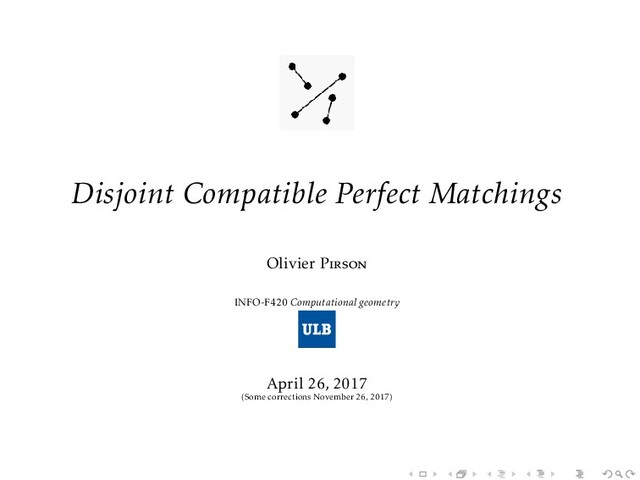 perfect matching S a set of 2n points p1, p2, p3,..., p2n in increasing order of their x-coordinates (and if necessary of their y-coordinates), The canonical perfect matching of S, writed N(S), is the perfect matching with segments p1—p2, p3—p4, p5—p6,... p2n−1—p2n. Disjoint Compatible Perfect Matchings 5 / 16