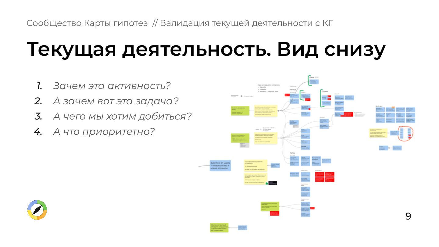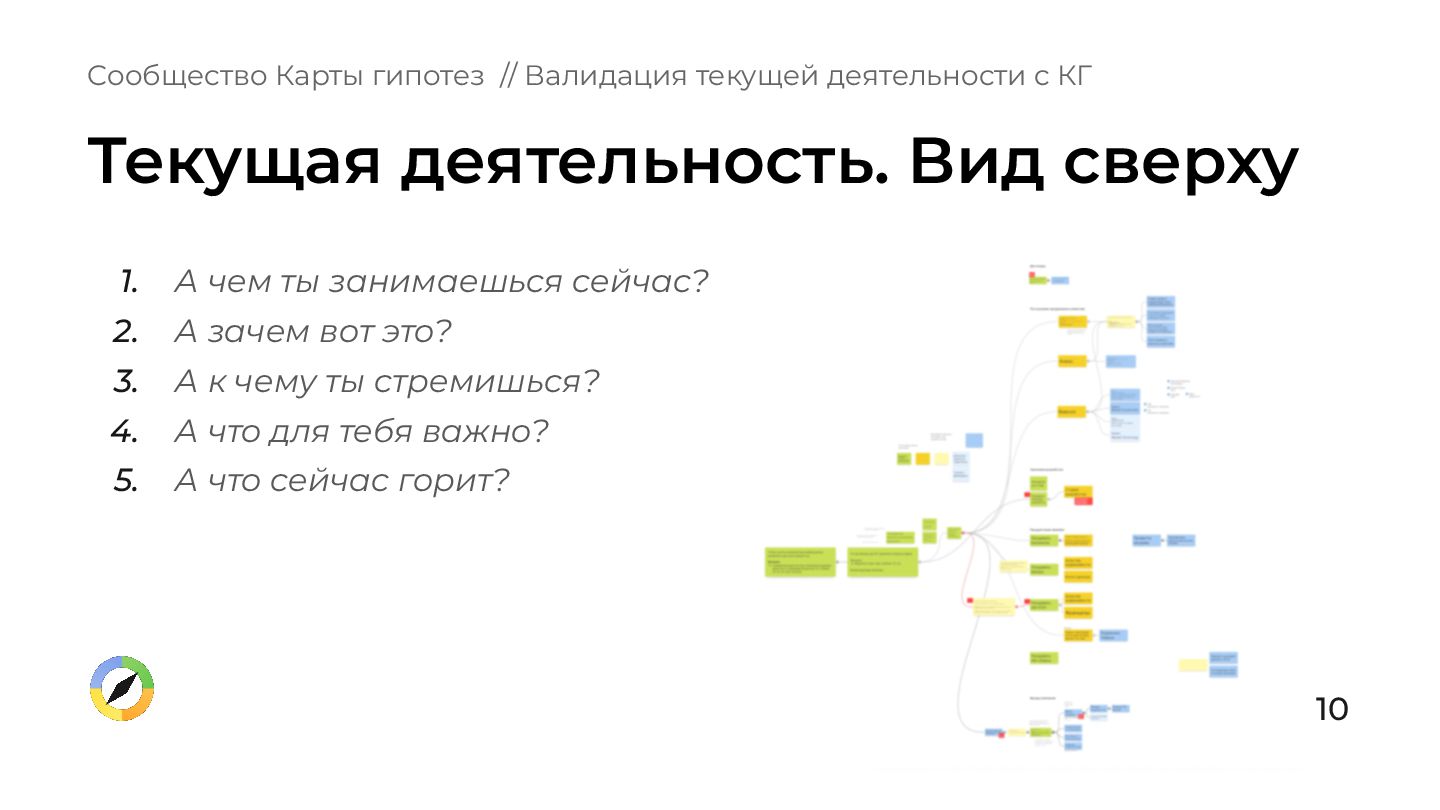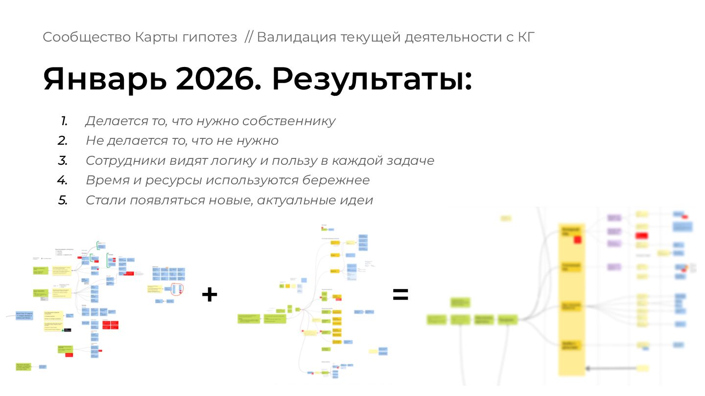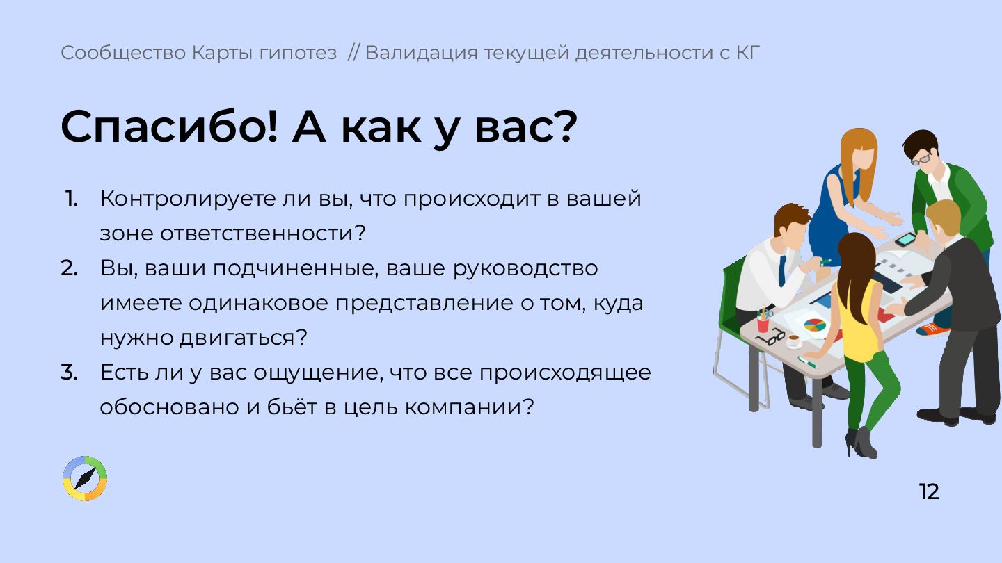 что происходит в вашей зоне ответственности? 2. Вы, ваши подчиненные, ваше руководство имеете одинаковое представление о том, куда нужно двигаться? 3. Есть ли у вас ощущение, что все происходящее обосновано и бьёт в цель компании? Сообщество Карты гипотез // Валидация текущей деятельности с КГ