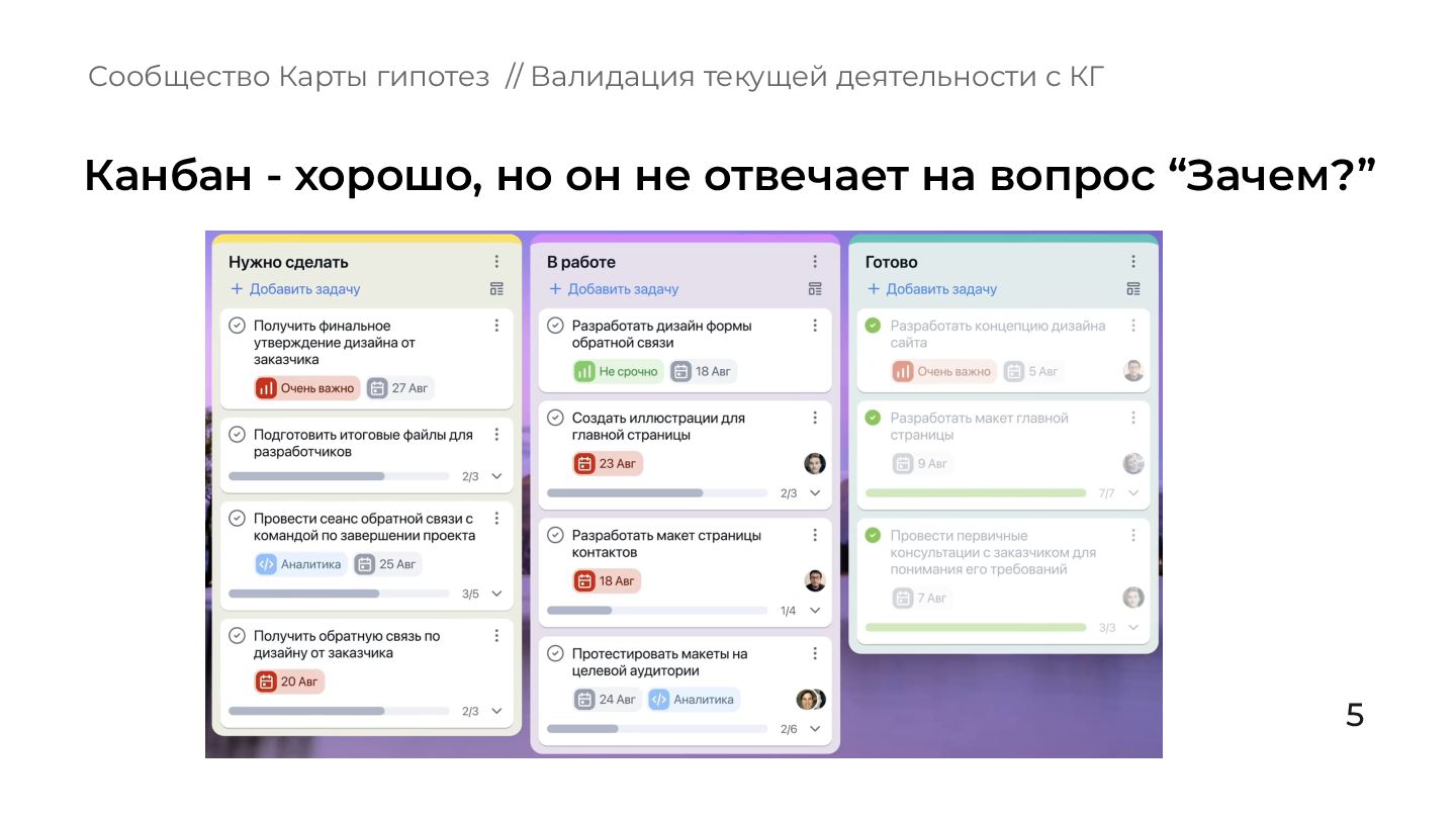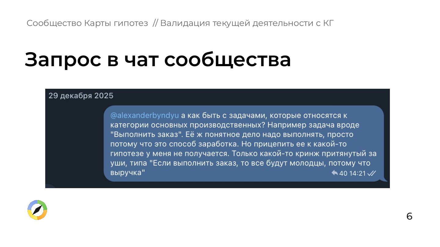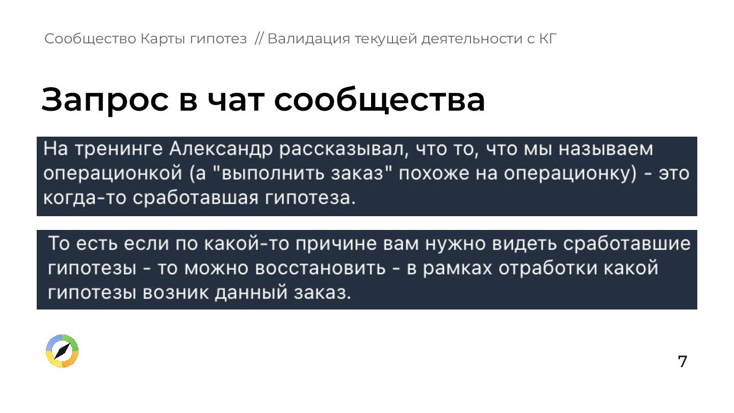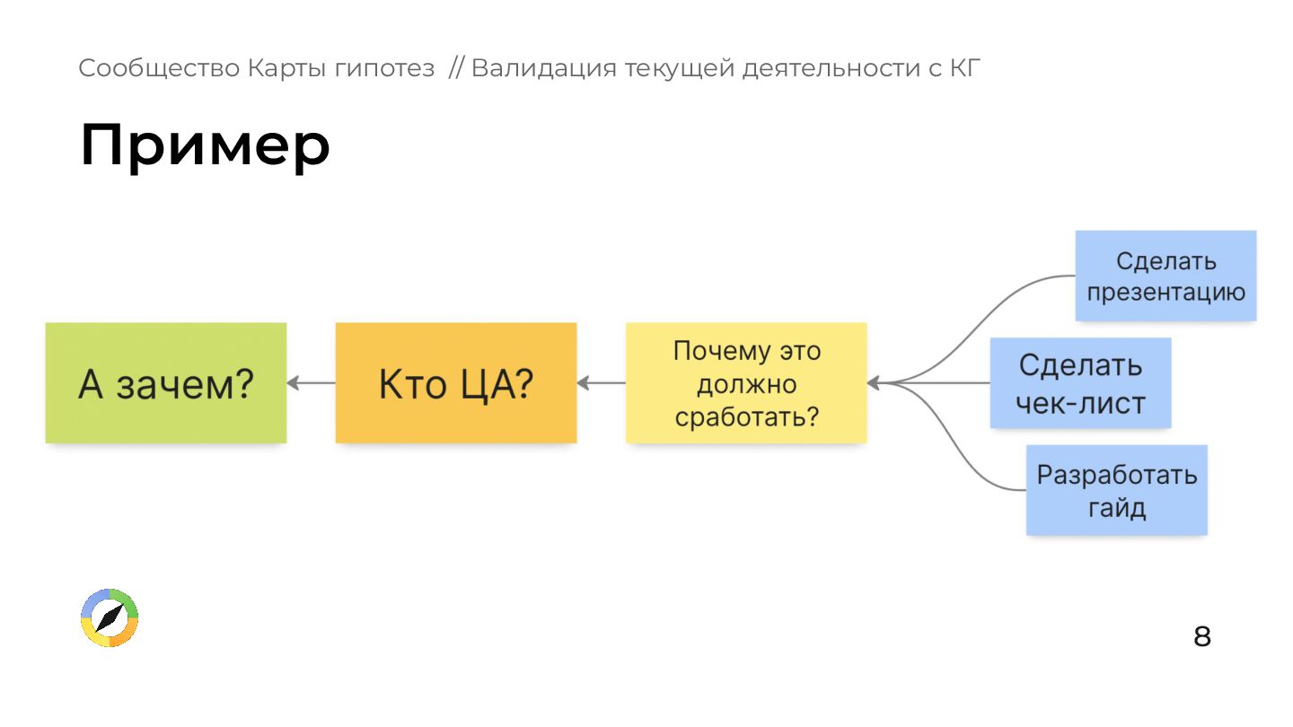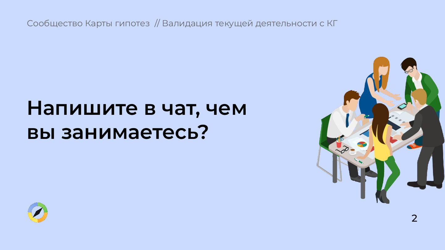 что происходит в вашей зоне ответственности? 2. Вы, ваши подчиненные, ваше руководство имеете одинаковое представление о том, куда нужно двигаться? 3. Есть ли у вас ощущение, что все происходящее обосновано и бьёт в цель компании? Сообщество Карты гипотез // Валидация текущей деятельности с КГ